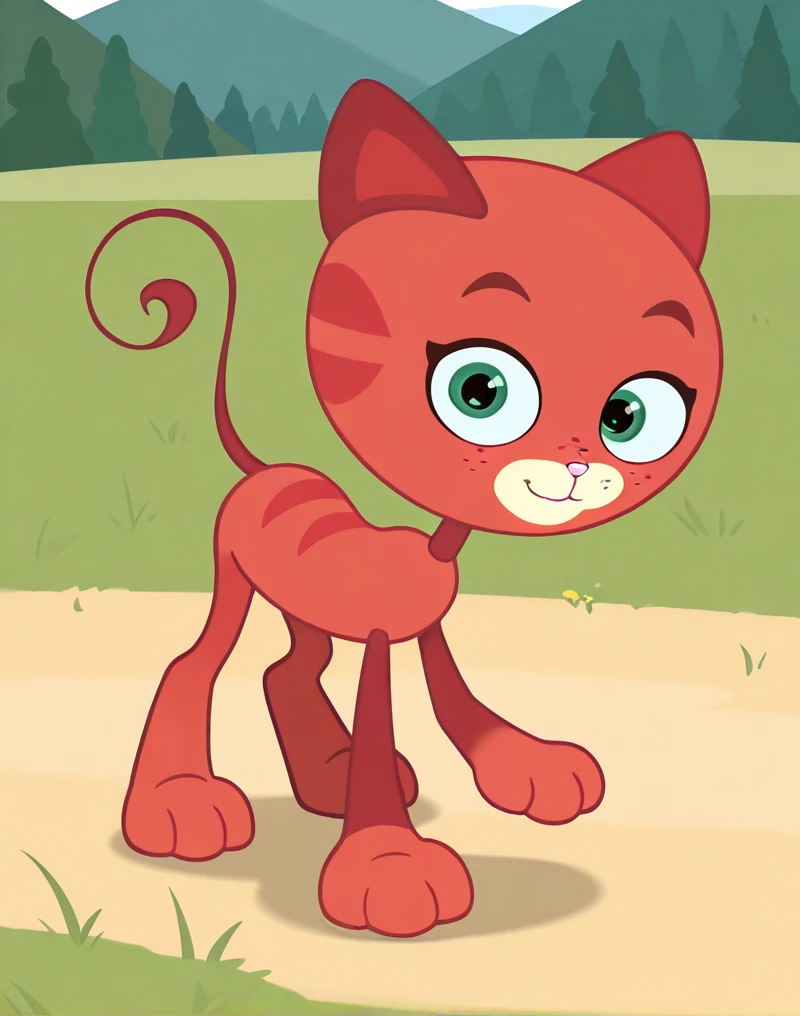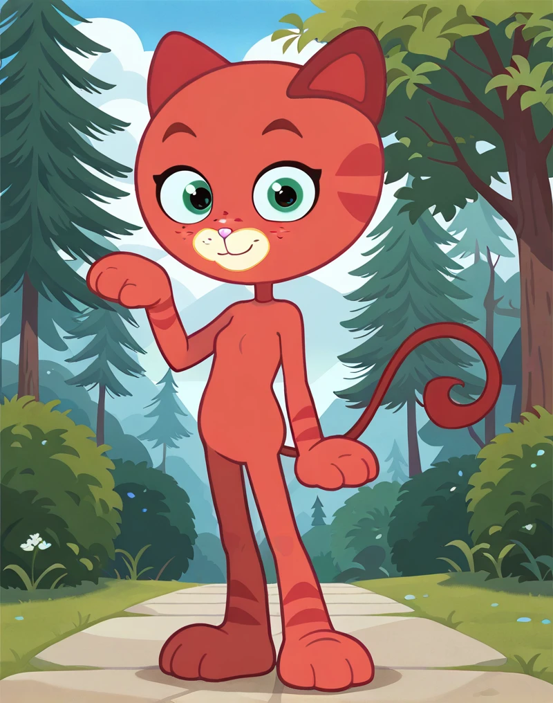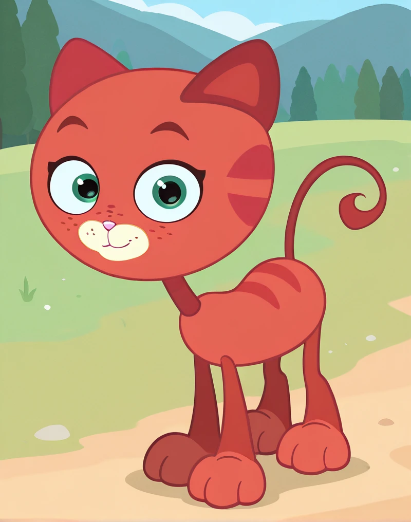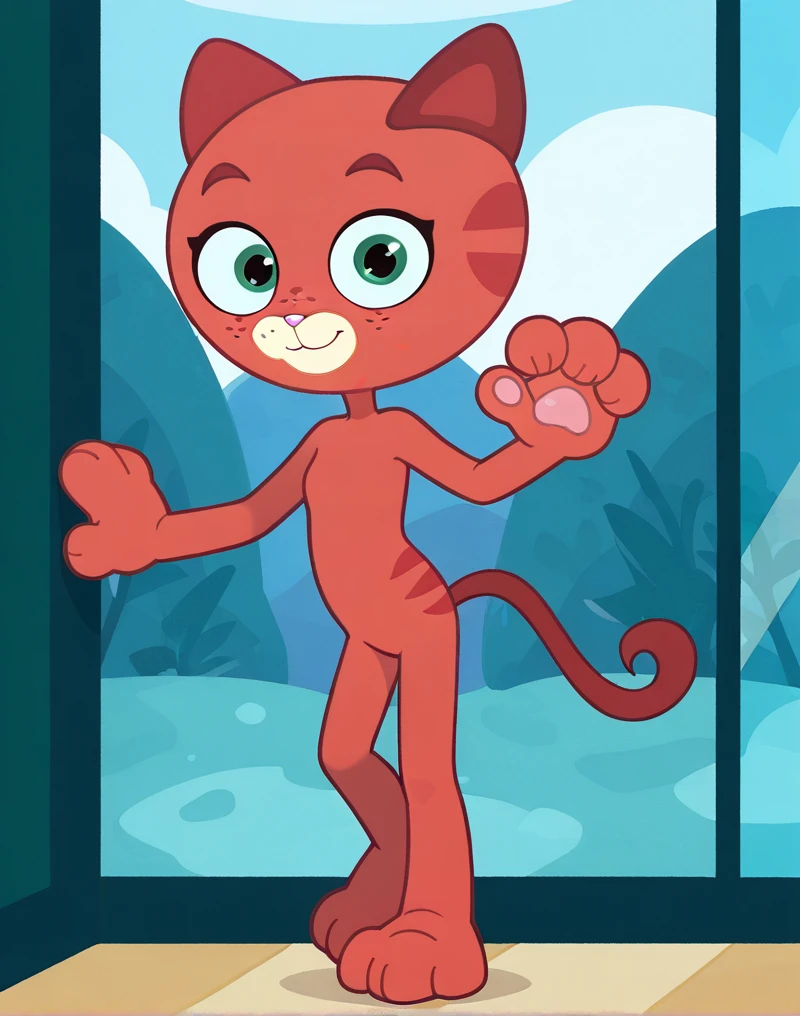 minihollycucci, cat, furry, furry female, 1girl, red fur, red and white fur, three tone fur, white sclera, green eyes, pink nose, two eyebrows, cat ears, cat tail, thin neck, thin hand, thin legs, thin tail, freckles, paws, no humans, source_cartoon, style_cartoon, 2d