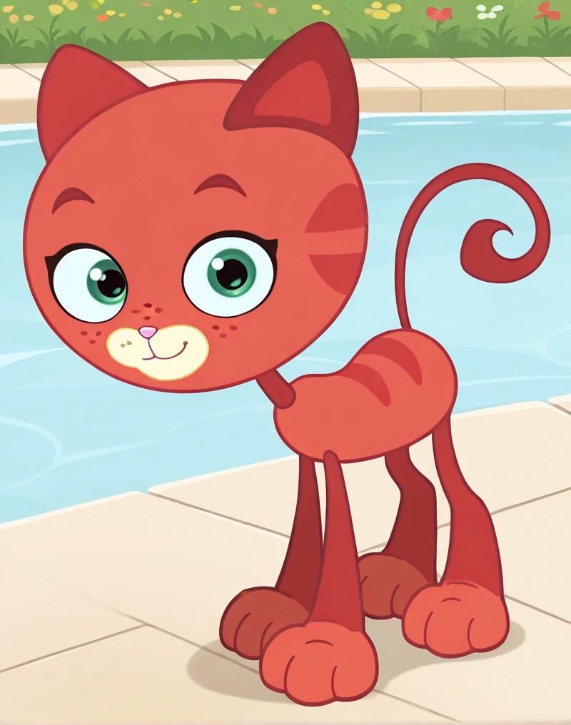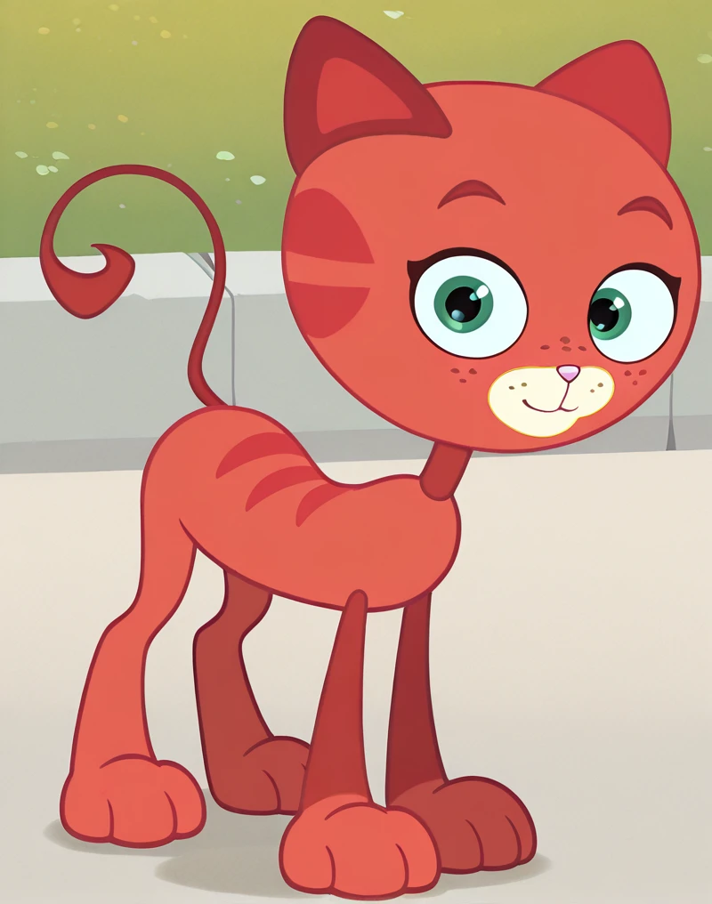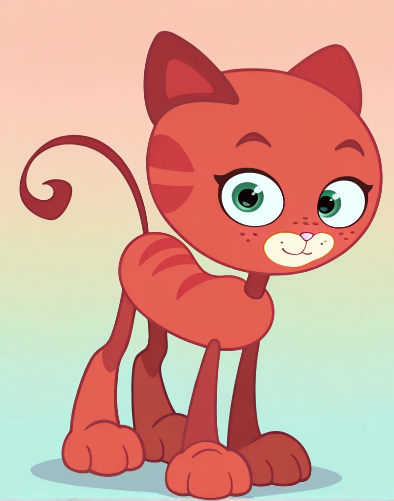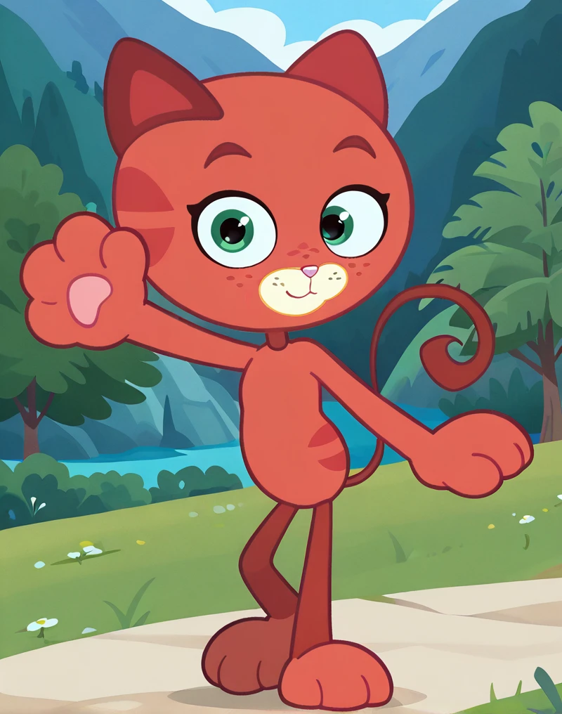 minihollycucci, cat, furry, furry female, 1girl, red fur, red and white fur, three tone fur, white sclera, green eyes, pink nose, two eyebrows, cat ears, cat tail, thin neck, thin hand, thin legs, thin tail, freckles, paws, no humans, source_cartoon, style_cartoon, 2d