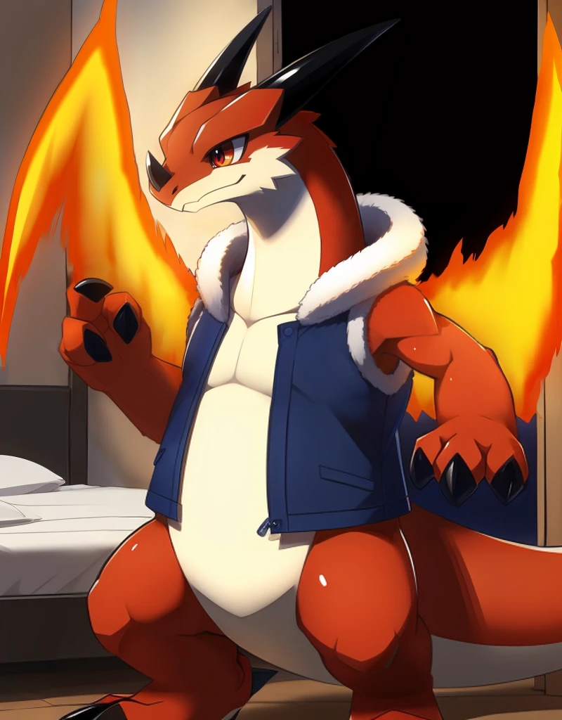 Related words : colored skin, red fur, two-tone fur, red eyes, tusks, fangs, claws, horns, dragon boy, dragon tail, wings, red wings, orange wings, fire, jacket, fur-trimmed jacket, fur trim, open jacket, cropped jacket, vest, open vest, open clothes, belt