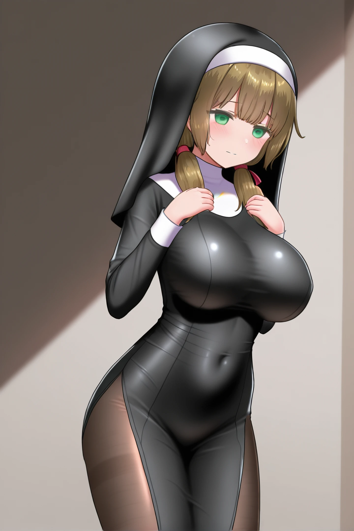 furodi, 1girl, brown hair, green eyes, bangs, twintails, hair over shoulder, ?????????????, hair ribbon, nun, habit, blonde necklace, covered navel, black dress, long sleeves, pantyhose蓝白???