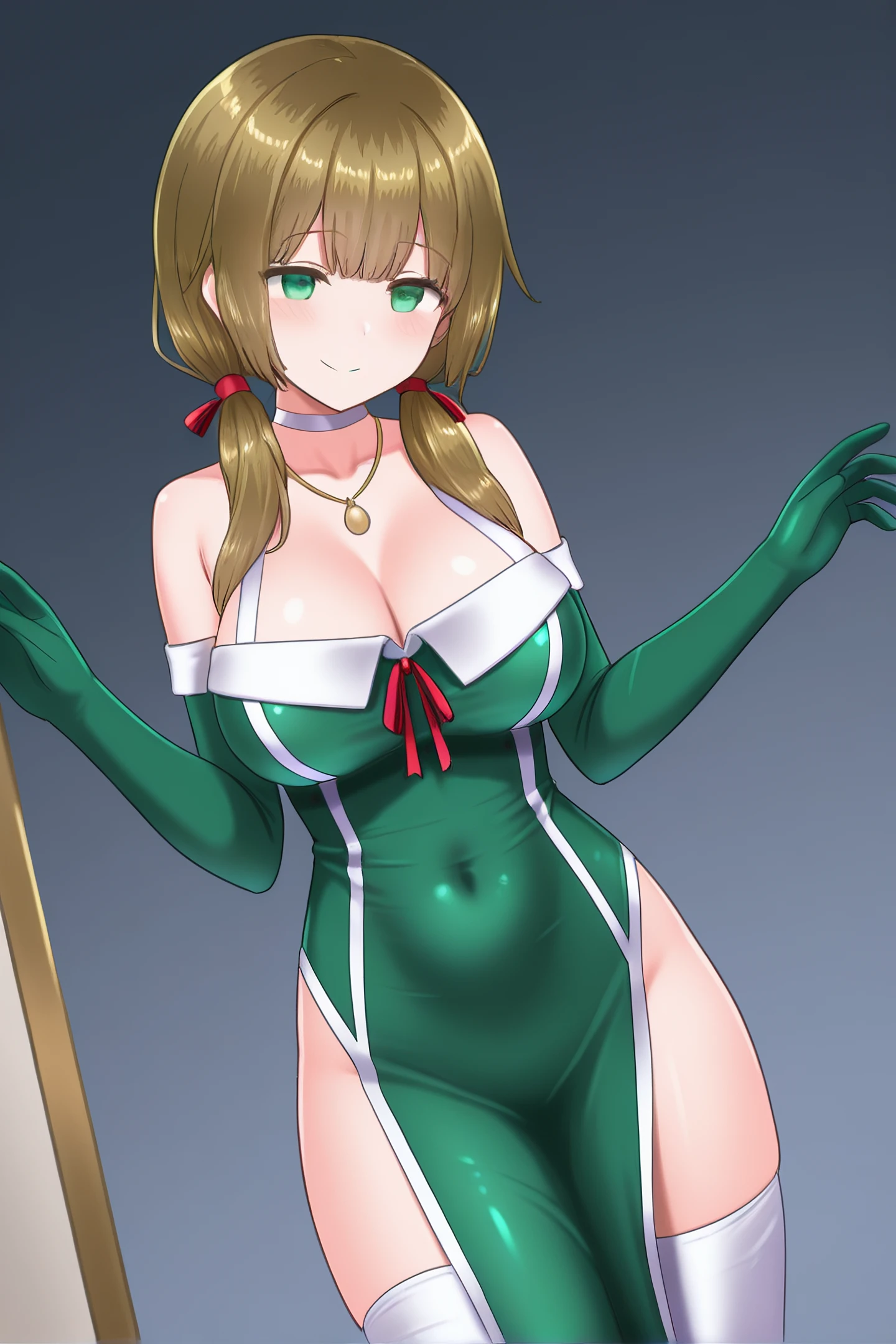 furodi, 1girl, brown hair, green eyes, bangs, twintails, hair over shoulder, ?????????????, ???? shoulders, red ribbon, collarbone, green dress, white striped, elbow gloves, blonde necklace, dress, green gloves, white choker, cleavage, pelvic_curtain, string tie, side slit, covered navel, white thighhighs触手服