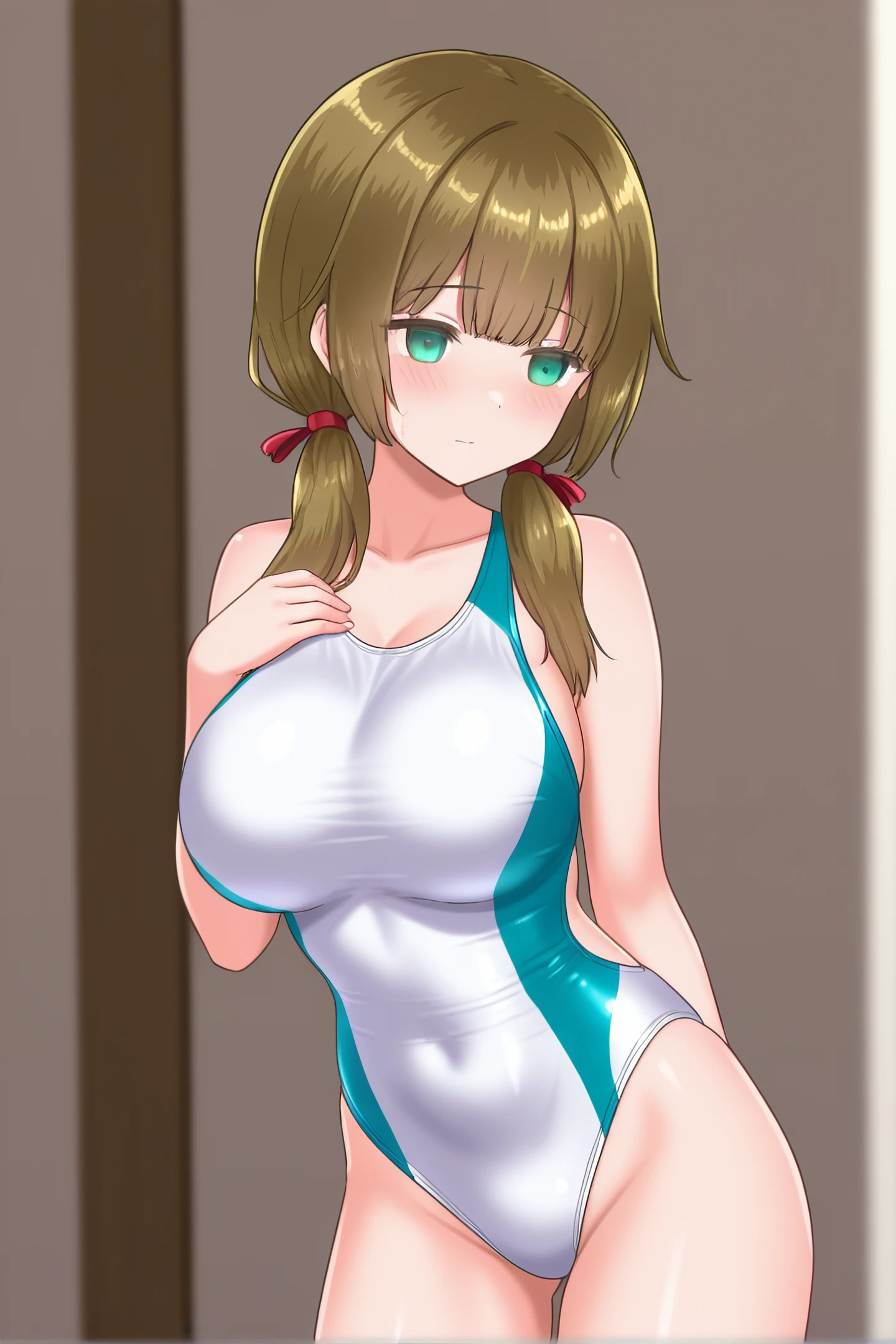furodi, 1girl, brown hair, green eyes, bangs, twintails, hair over shoulder, ?????????????, hair ribbon, white one-piece swimsuit, competition swimsuit校服