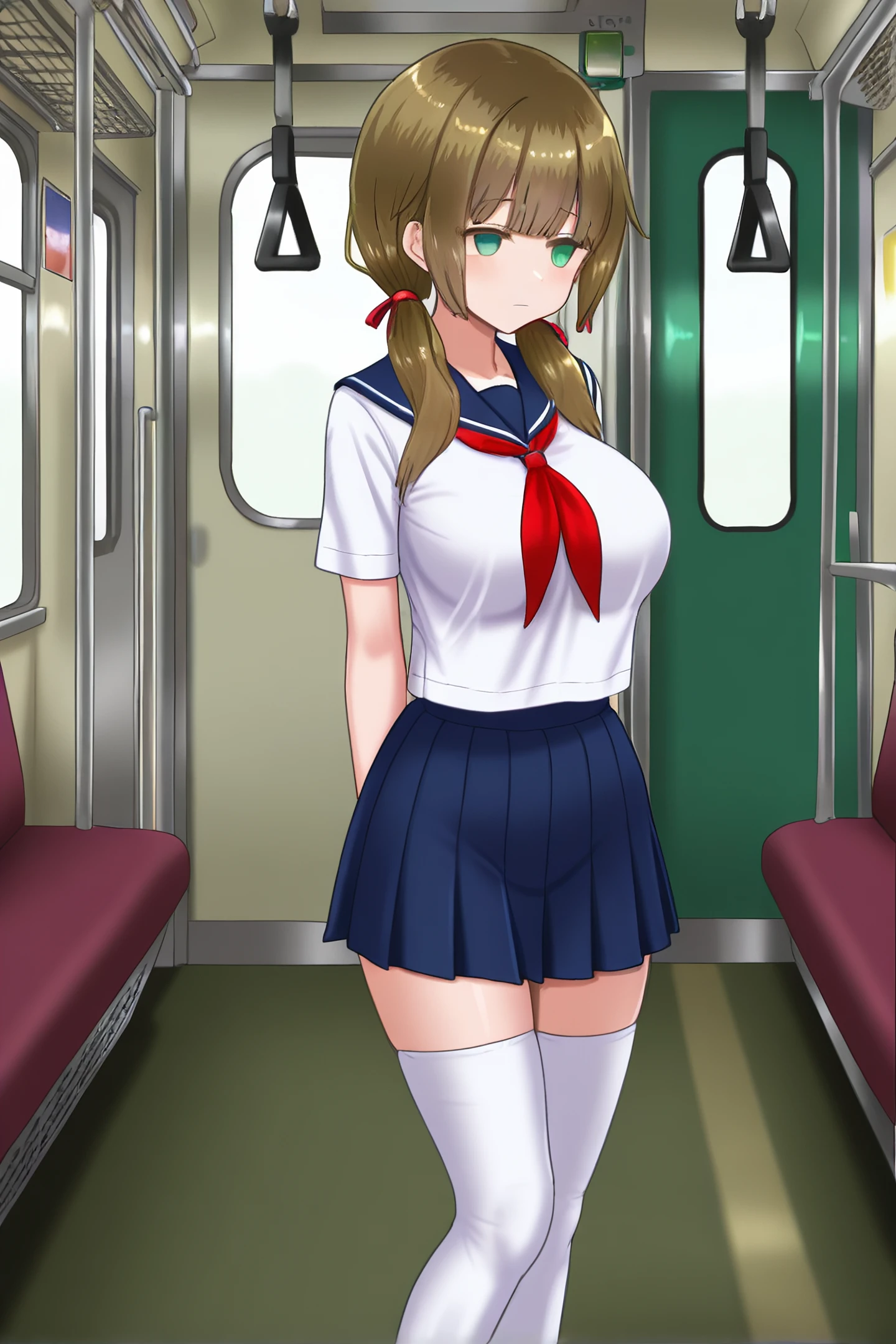 furodi, 1girl, brown hair, green eyes, bangs, twintails, hair over shoulder, ?????????????, hair ribbon, school uniform, short sleeves, serafuku, blue sailor collar, red neckerchief, white thighhighs, dark blue skirt, pleated skirt, zettai ryouiki????