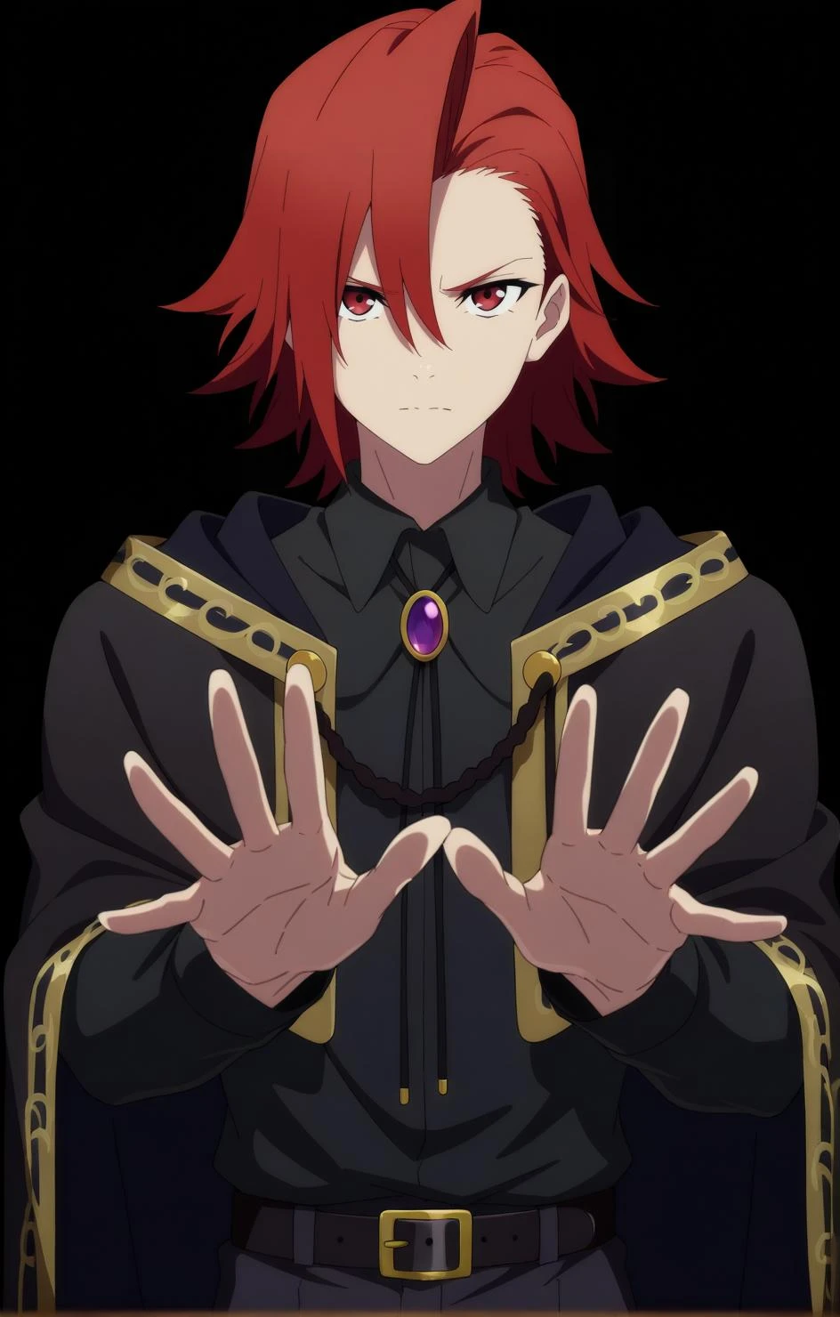 sion_ulster, red hair, red eyes, hair between eyes, asymmetrical bangs,