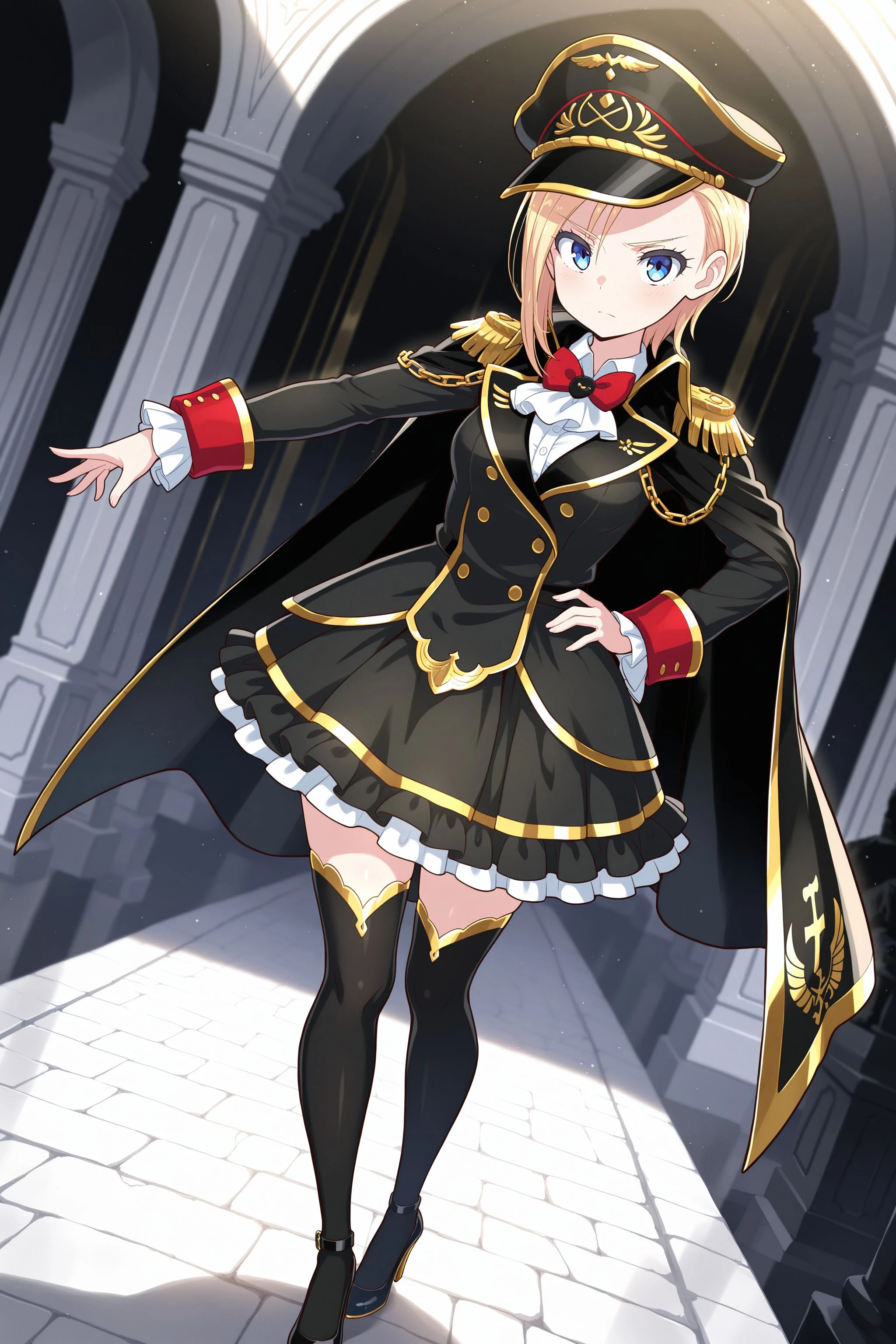 school uniform: school uniform, blazer, long sleeves, red bowtie, ascot, white shirt, armband, pleated skirt, grey skirt, frills, white thighhighs, garter straps, mary janes, high heels