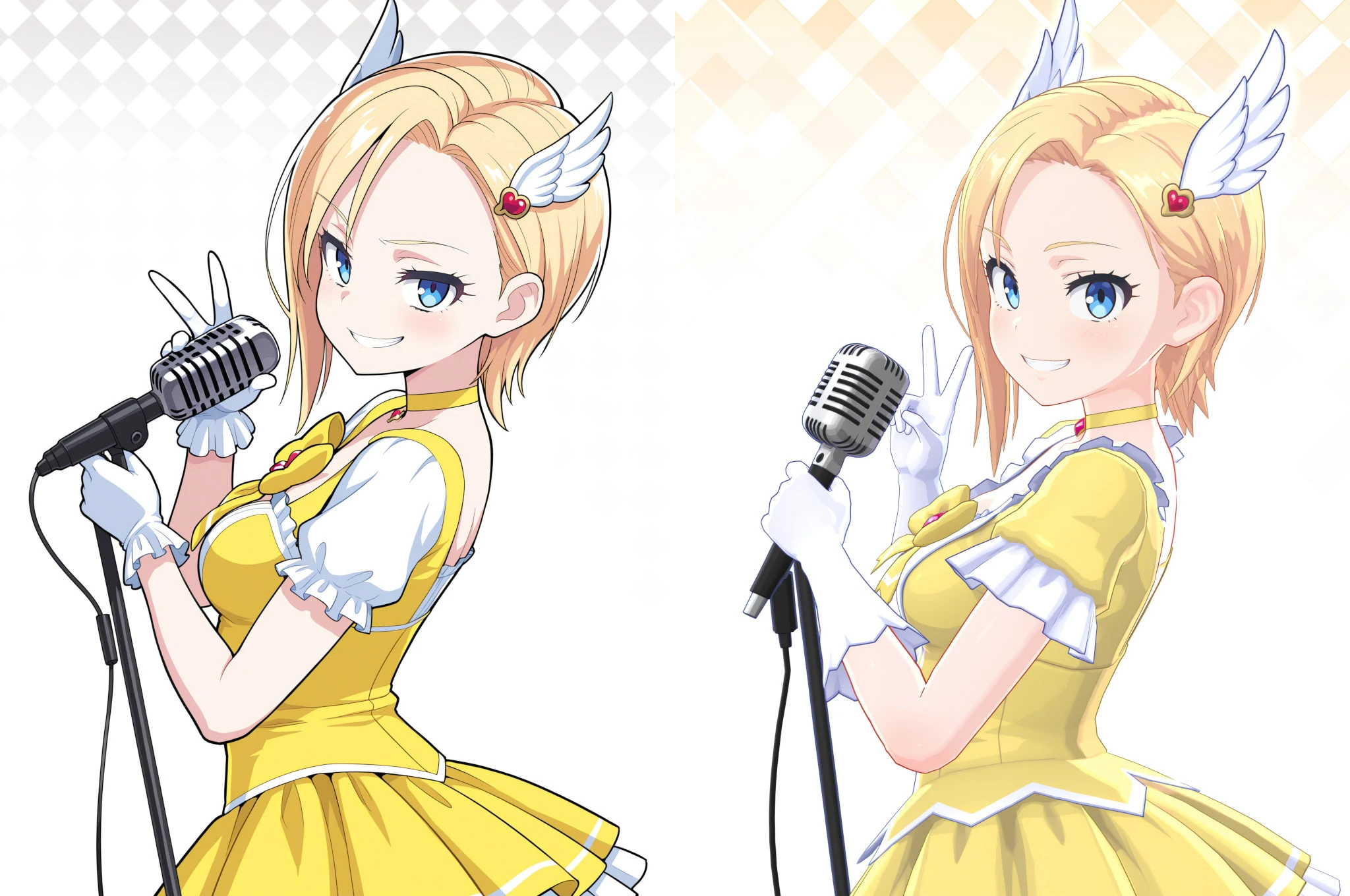 Magica2019: magica2019, wing hair ornament, choker, yellow dress, yellow bowtie, white gloves, plated skirt, frills, high heel boots