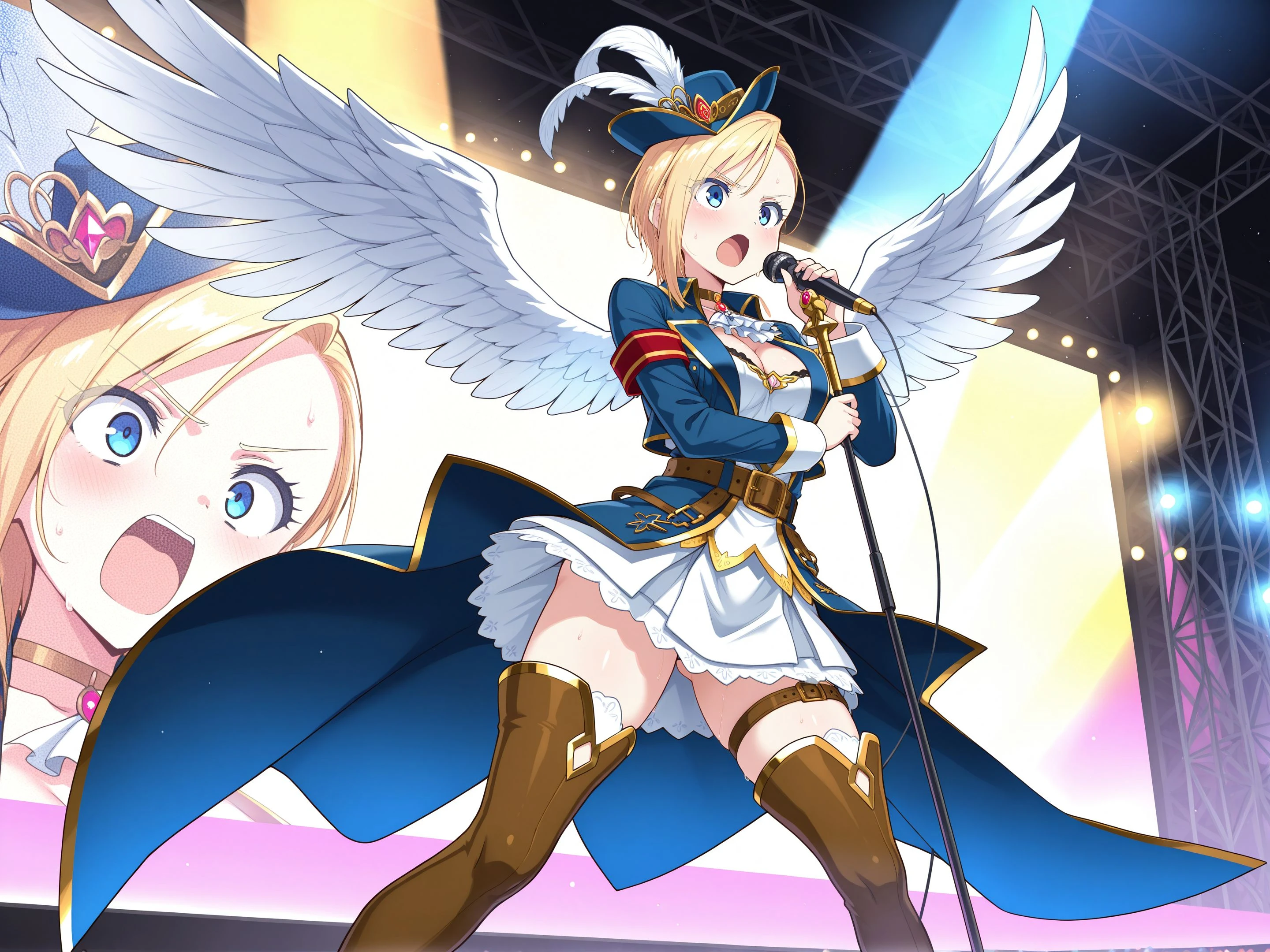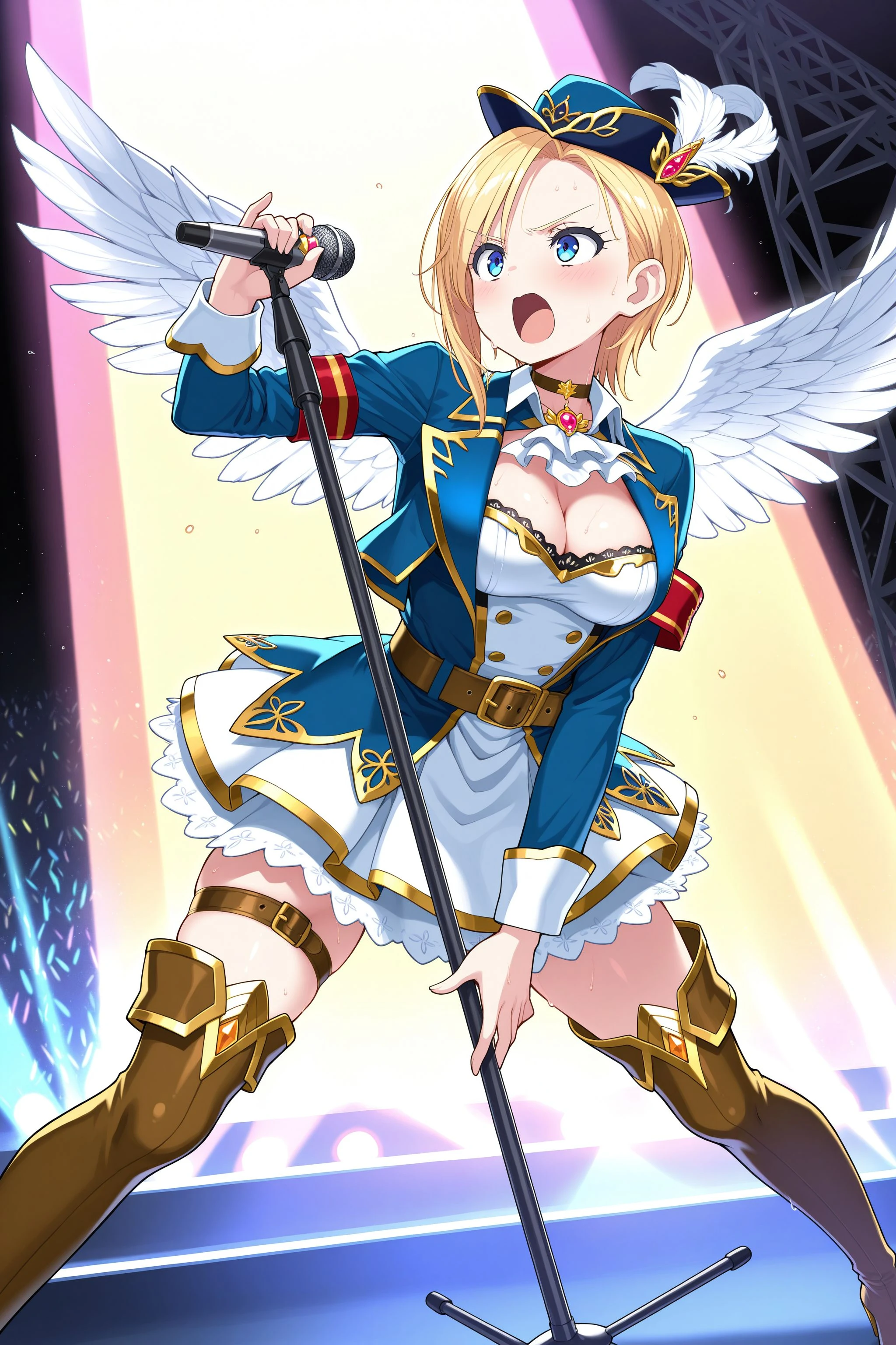 XenosMagica: xenosmagica, hat feather, blue headwear, blue jacket, wing collar, open jacket, choker, ascot, gem, long sleeves, white dress, cleavage, armband, feathered wings, belt, white skirt, thigh strap, thigh boots, high heel boots, brown footwear, gold trim
