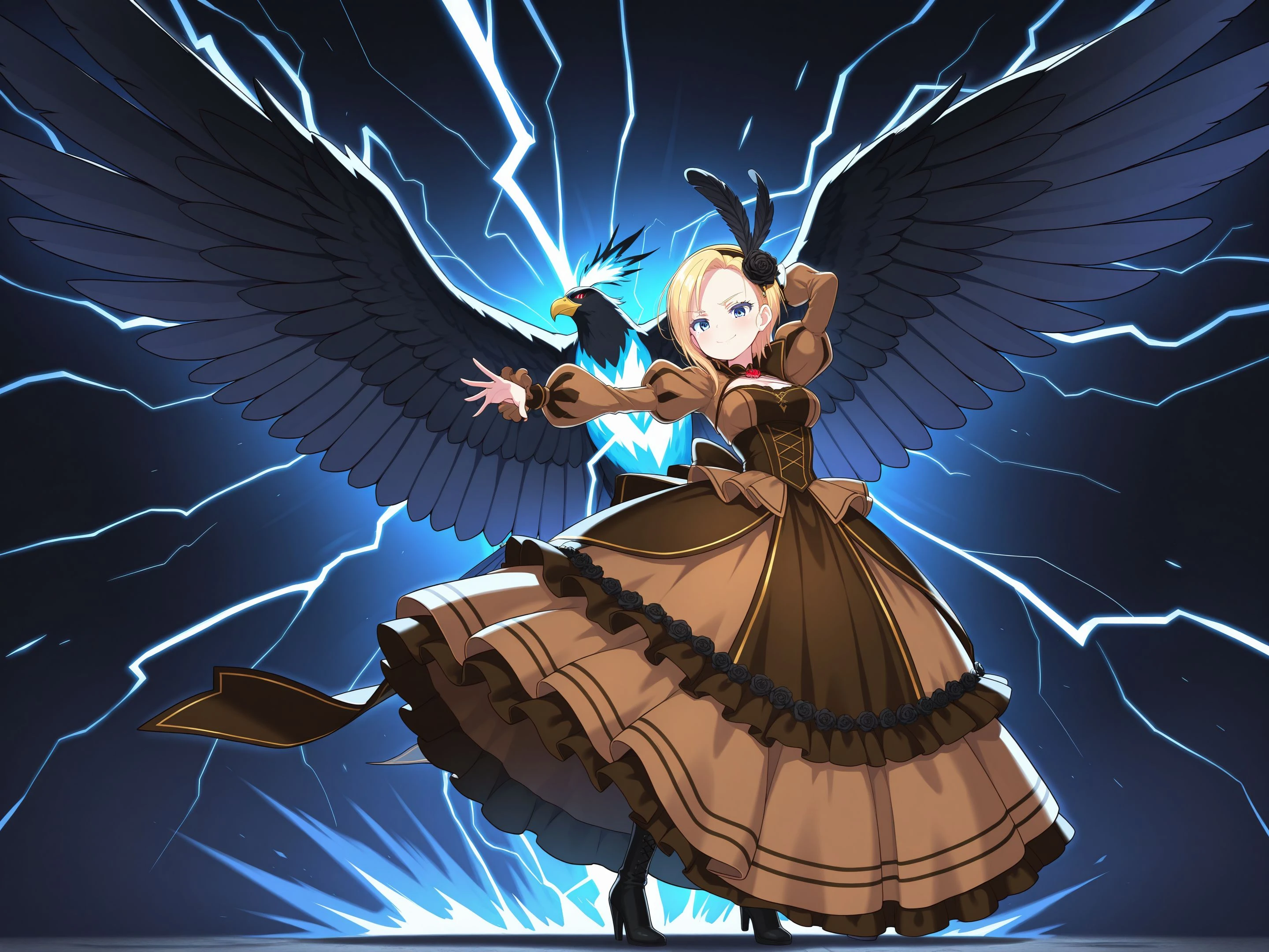 MagicaMaiden: magicamaiden, black feathers, head feather, black hairband, hair flower, black rose, brown dress, puffy sleeves, long Sleeves, long skirt, layered skirt, brown skirt, black skirt, frills, black footwear, high heel boots