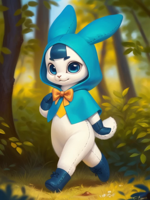 TadonaPopinQ, hood with bunny ears, dark blue boots, dark blue gloves, dark blue bangs, bow tie, blue eyes, (plush doll body,) , chibi,