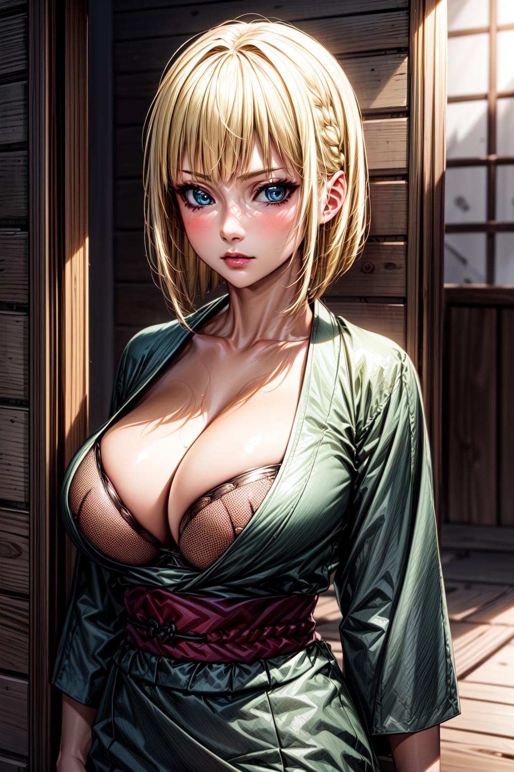 SamuiNarutoNDV, 1girl, blonde hair, short hair, blue eyes, huge breasts, cleavage, bangs, fishnet topBest weight: 0.6-0.8