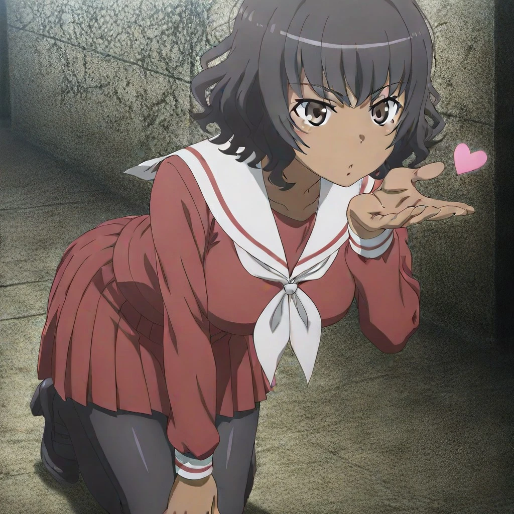 xochitl \(index\), black hair, short hair, bangs, brown eyes, dark-skinned female, white sailor collar, neckerchief, red school uniform, skirt, pantyhose, heels, large breasts, 1girl, solo