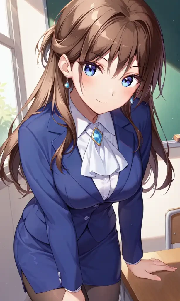 fujiki_maka, brown hair, long hair, blue eyes, teacher clothes, blue jacket, collared shirt, blue skirt, pantyhose, ascot, jewel,