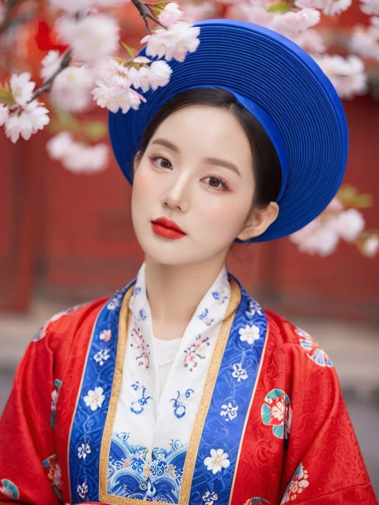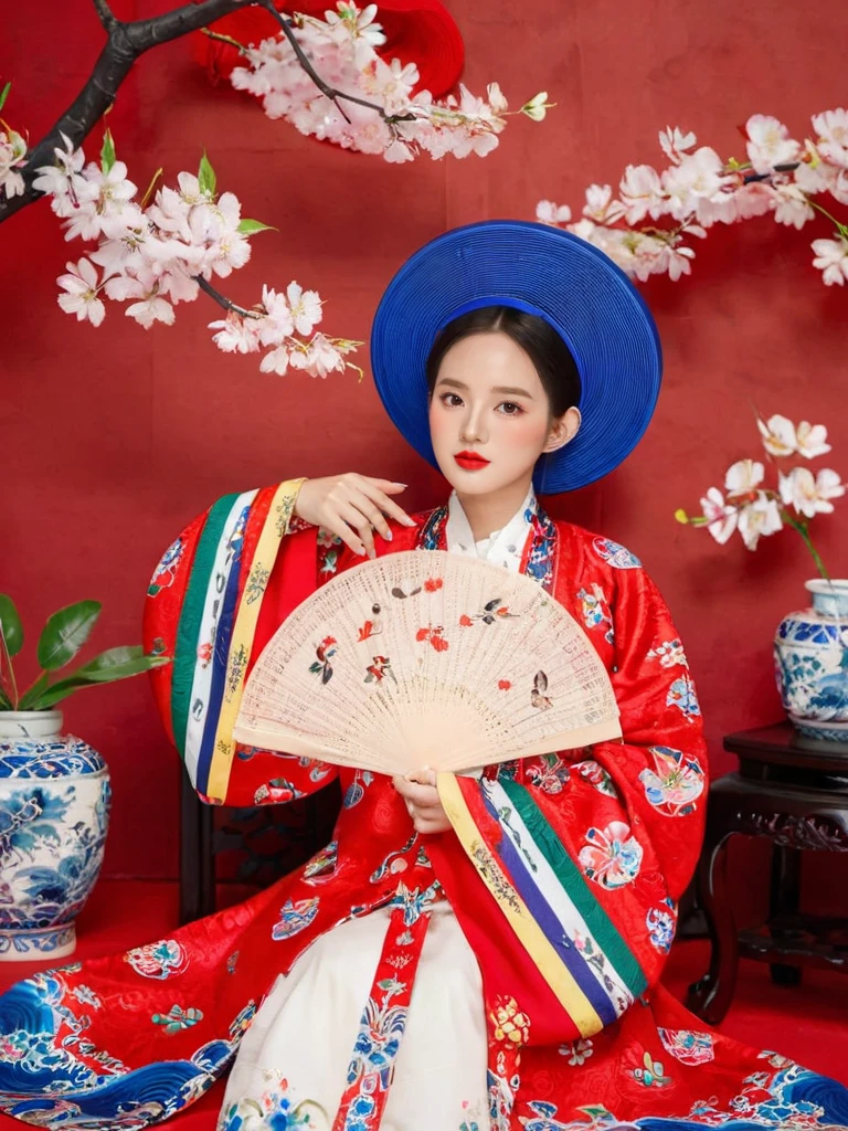 (Nhat Binh:1.5), 1girl, black hair, branch, cherry blossoms, floral background, floral print, flower, folding fan, blue hat, lipstick, red background, short hair, sitting, solo, vase, white flower((red traditional clothes)), (beautiful hands)<
