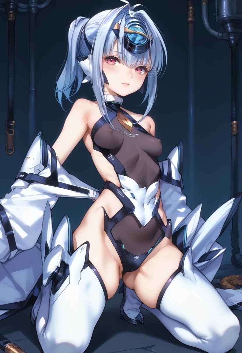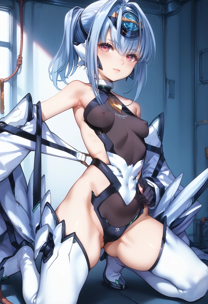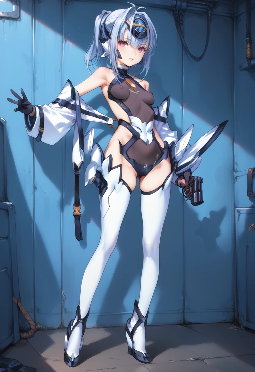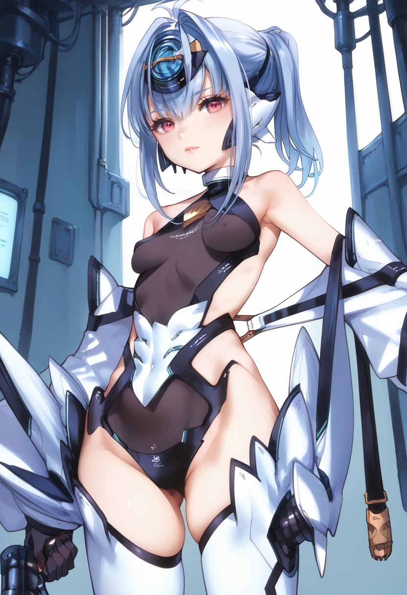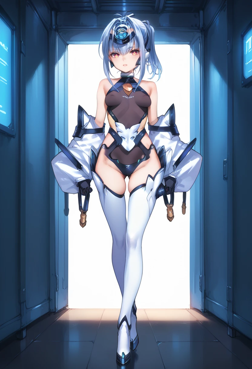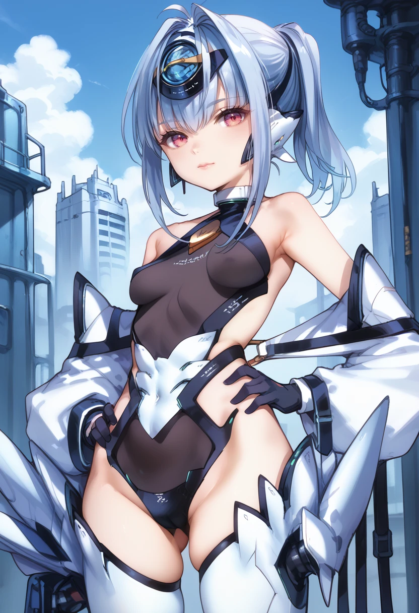 Tags (clothes): white forehead protector, black gloves, white detached sleeves, black highleg leotard, android, white thigh boots, small breasts