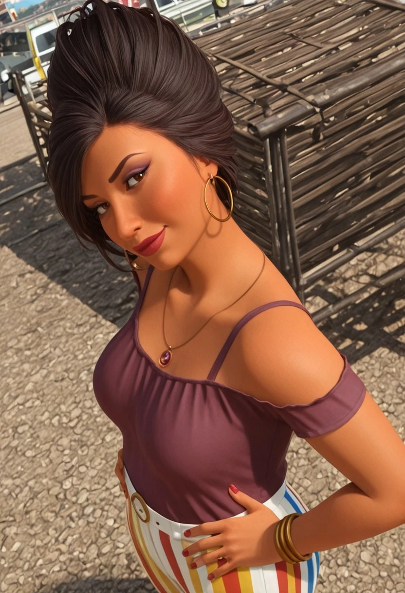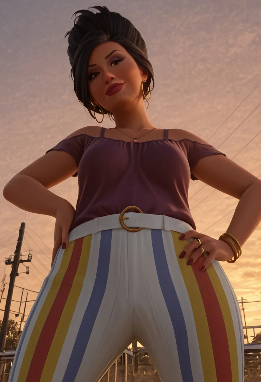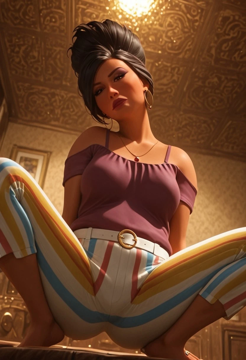natascha_rtzbb, 1girl, maturewoman, dark skin, large black bouffant hair, brown eyes, makeup, purple eyeshadow, red lipstick, red nails, purple sleeveless shirt, multicolored striped pants, jewelry, golden earrings (big golden hoop rings), necklace, gold bracelet on right arm, rings,