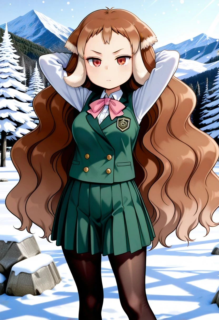 Green vest, green skirt, school uniform, collared shirt, black stockings, pink bow, white shirt, long-sleeved shirt,