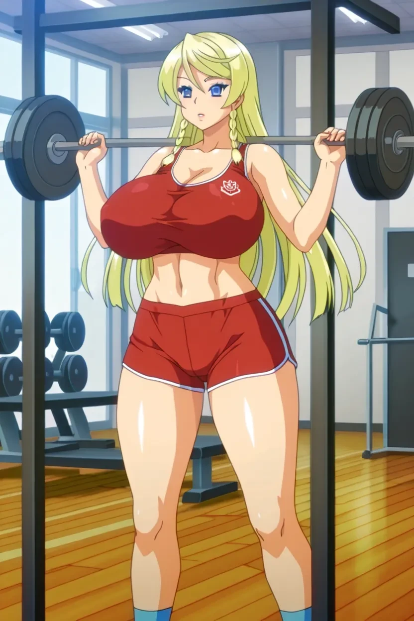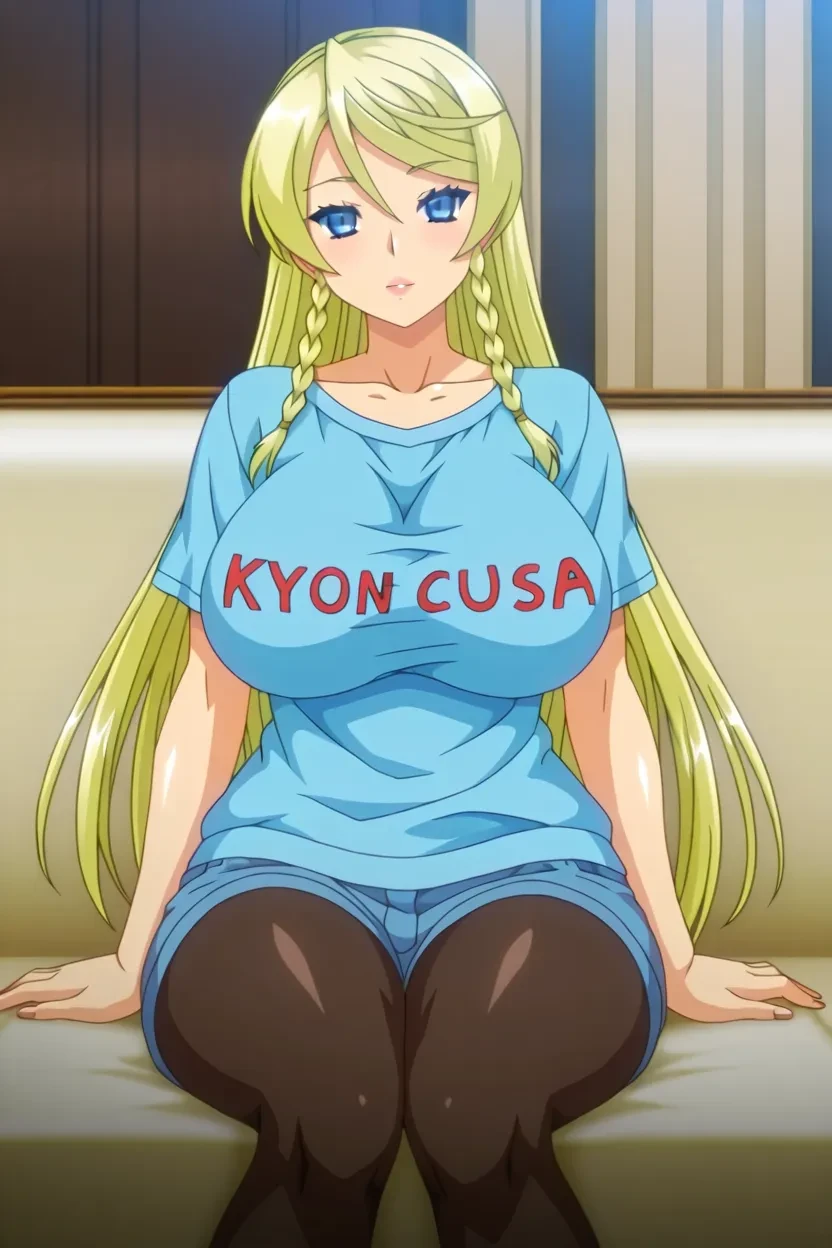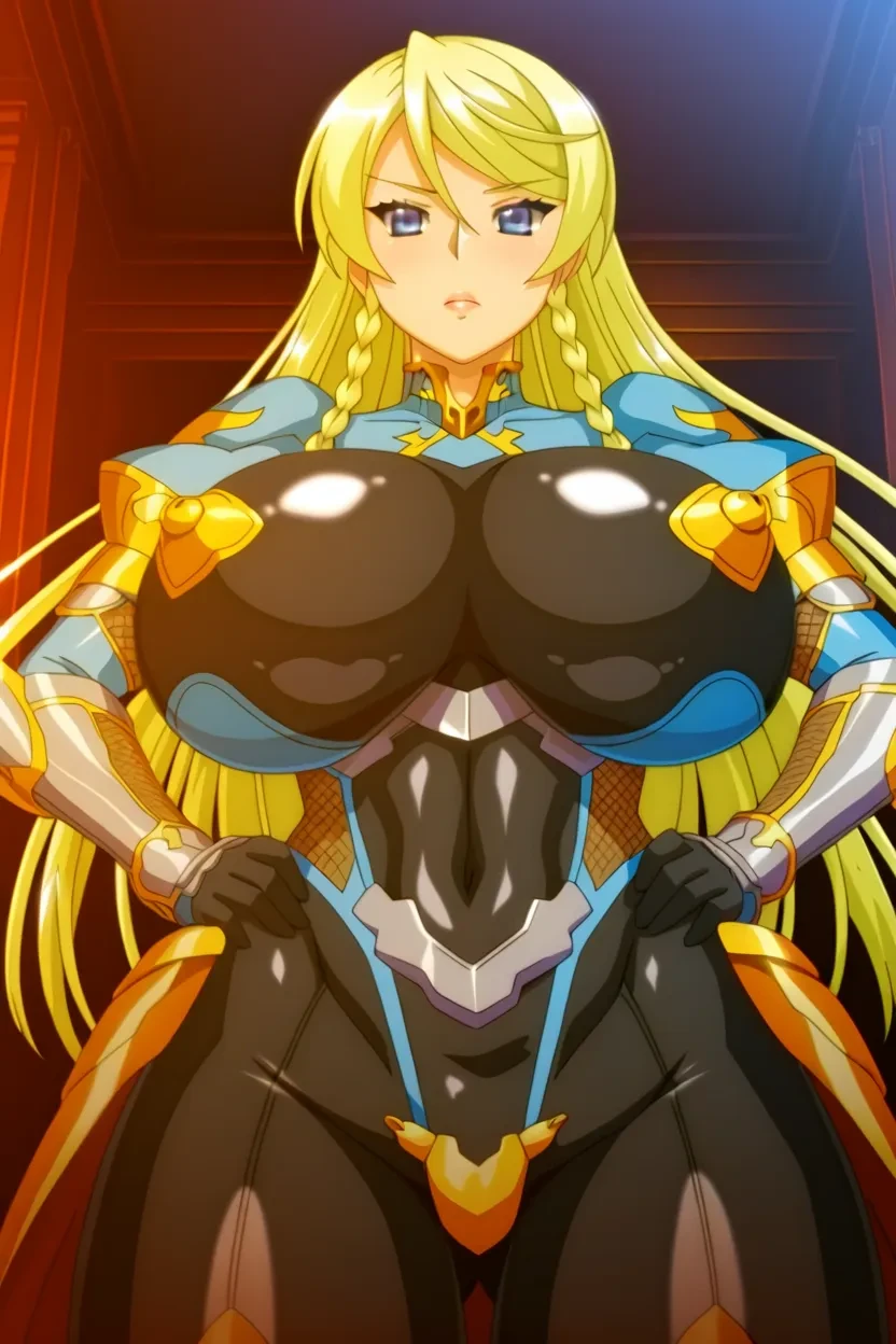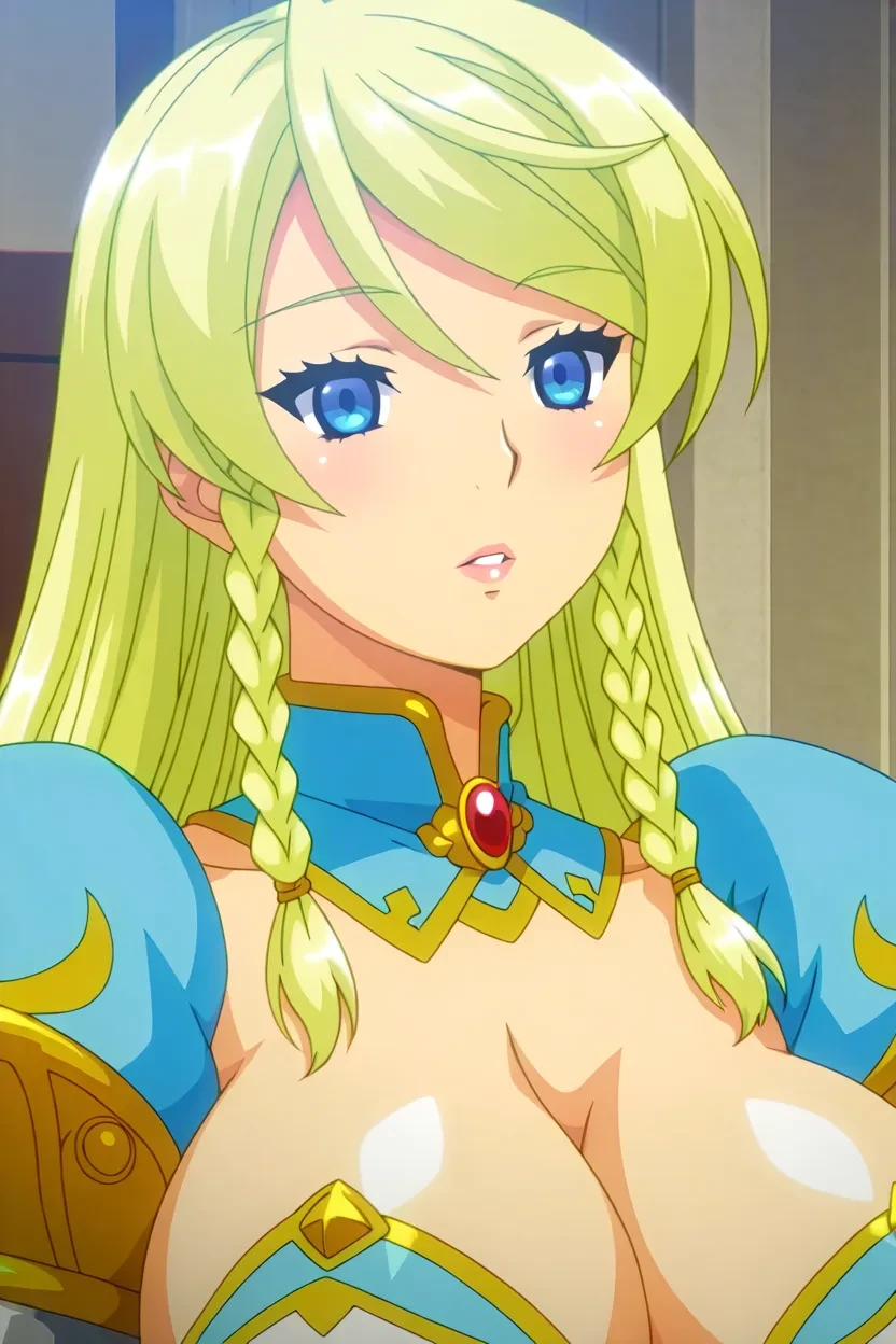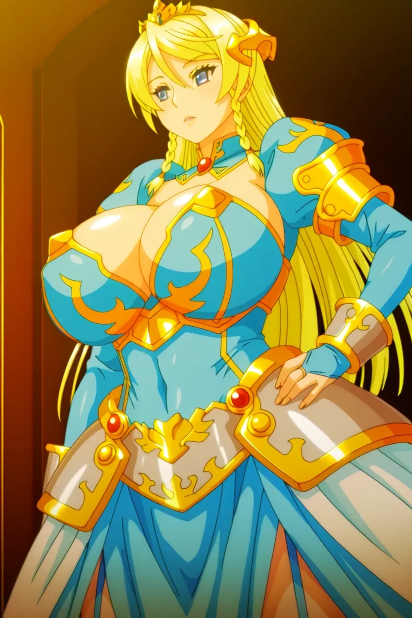 1girl, Farasha Awar Crusch (Kyonyuu Princess Saimin), blue_eyes, long hair, blonde_hair, twin braids, lips, massive breasts, curvy, wide hips, thick thighs, , fully , , , Kyonyuu Princess Saimin_art_style, 4k, HD, Hi-res, No-Flaws, excellent quality
