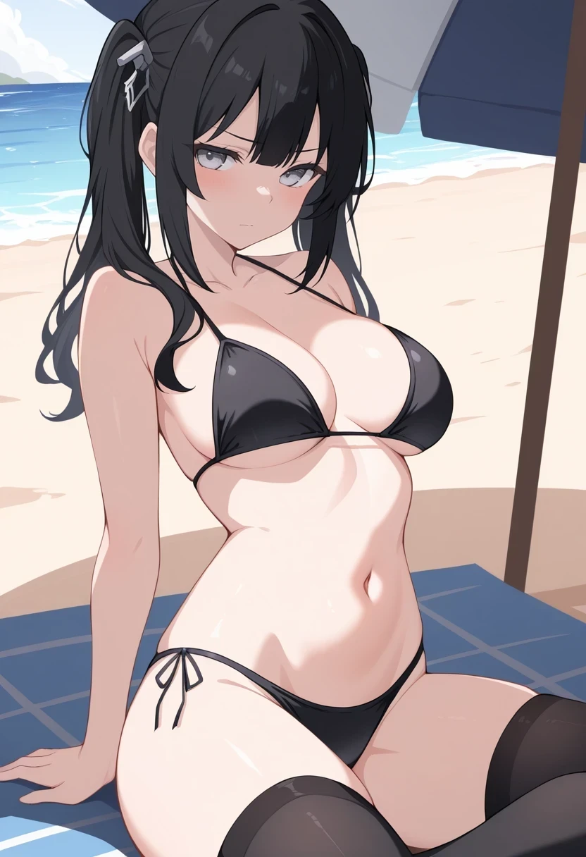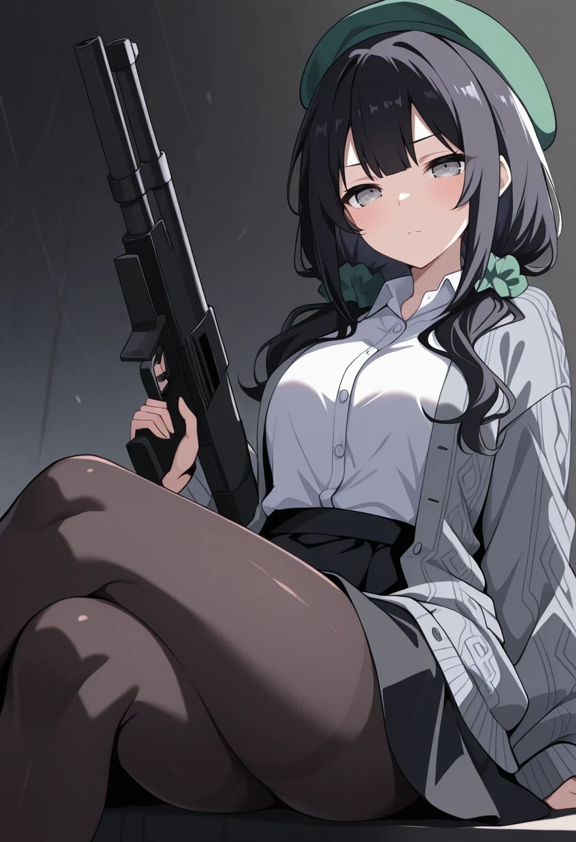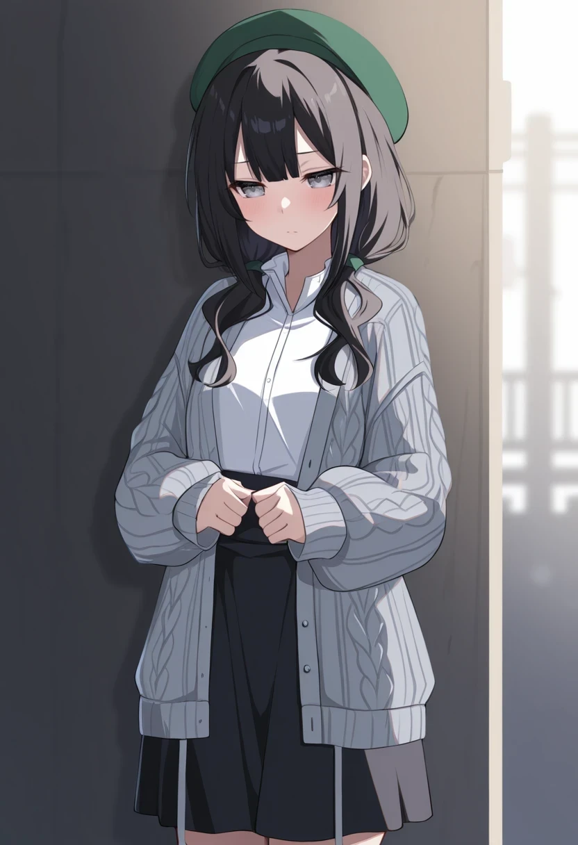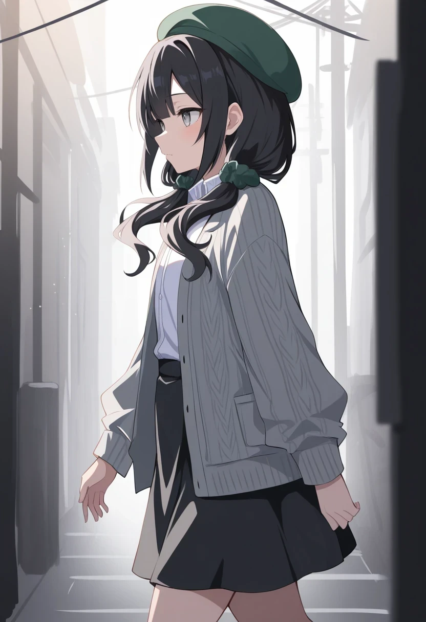 low_twintails, green scrunchie,green beret,grey_cardigan, white shirt,black skirt,Description