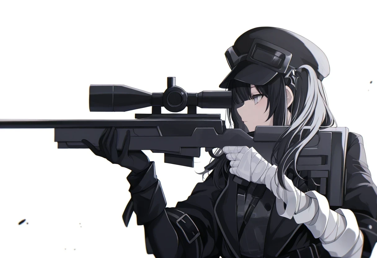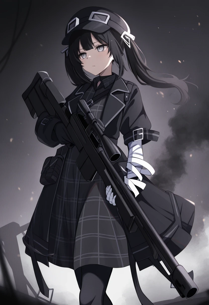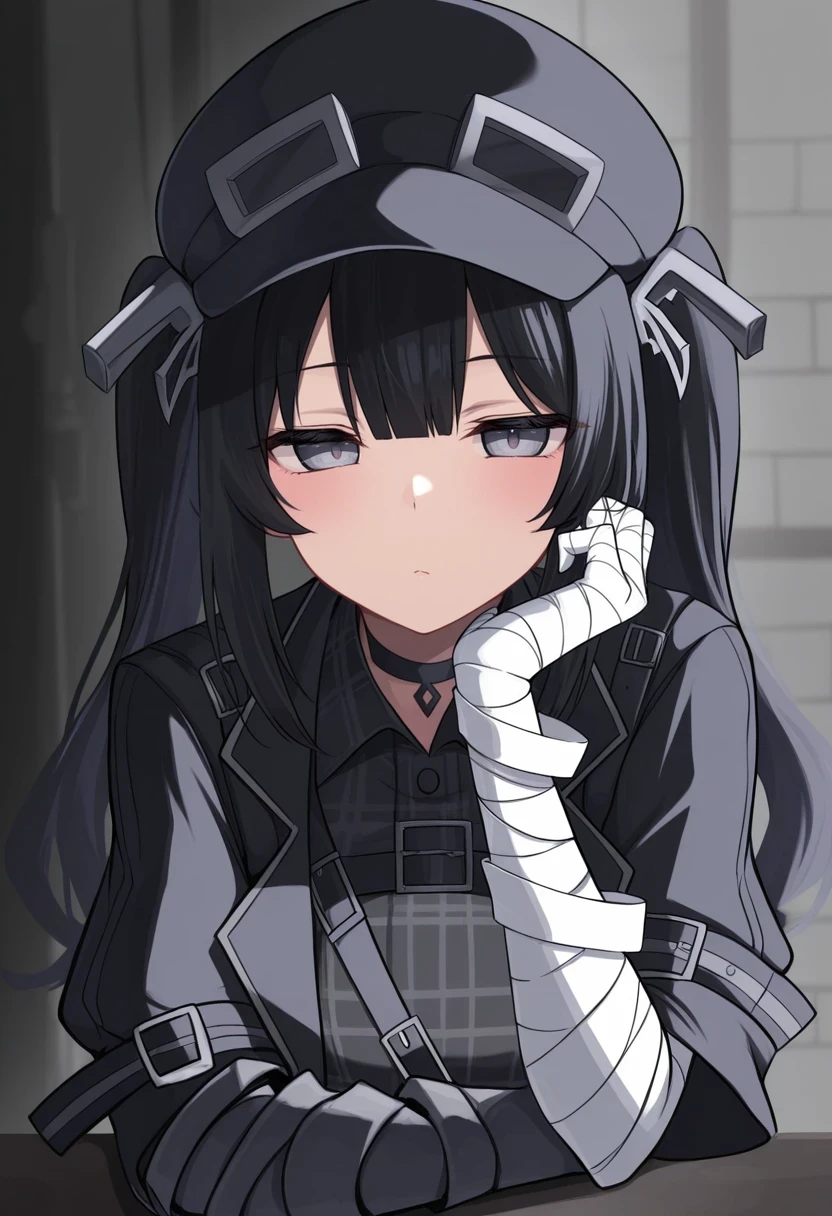 black coat,plaid dress,black hat,bandaged_arm, Official alternative outfit:
