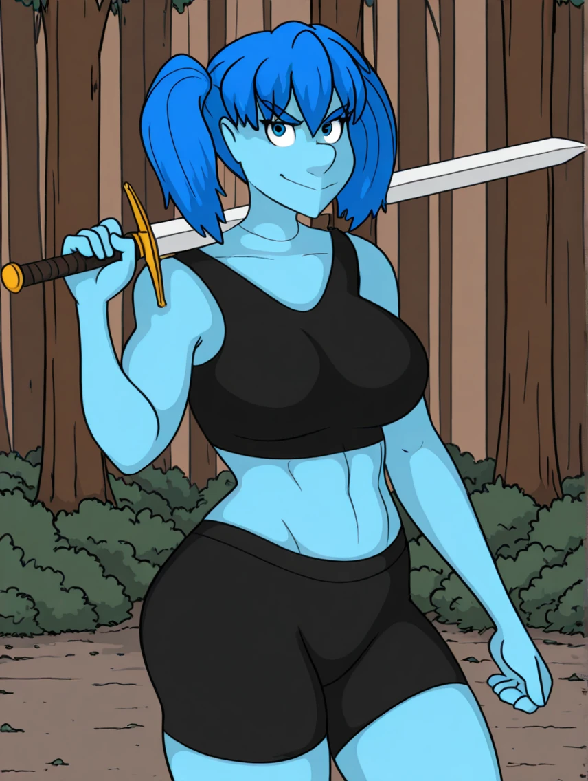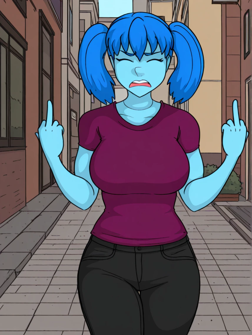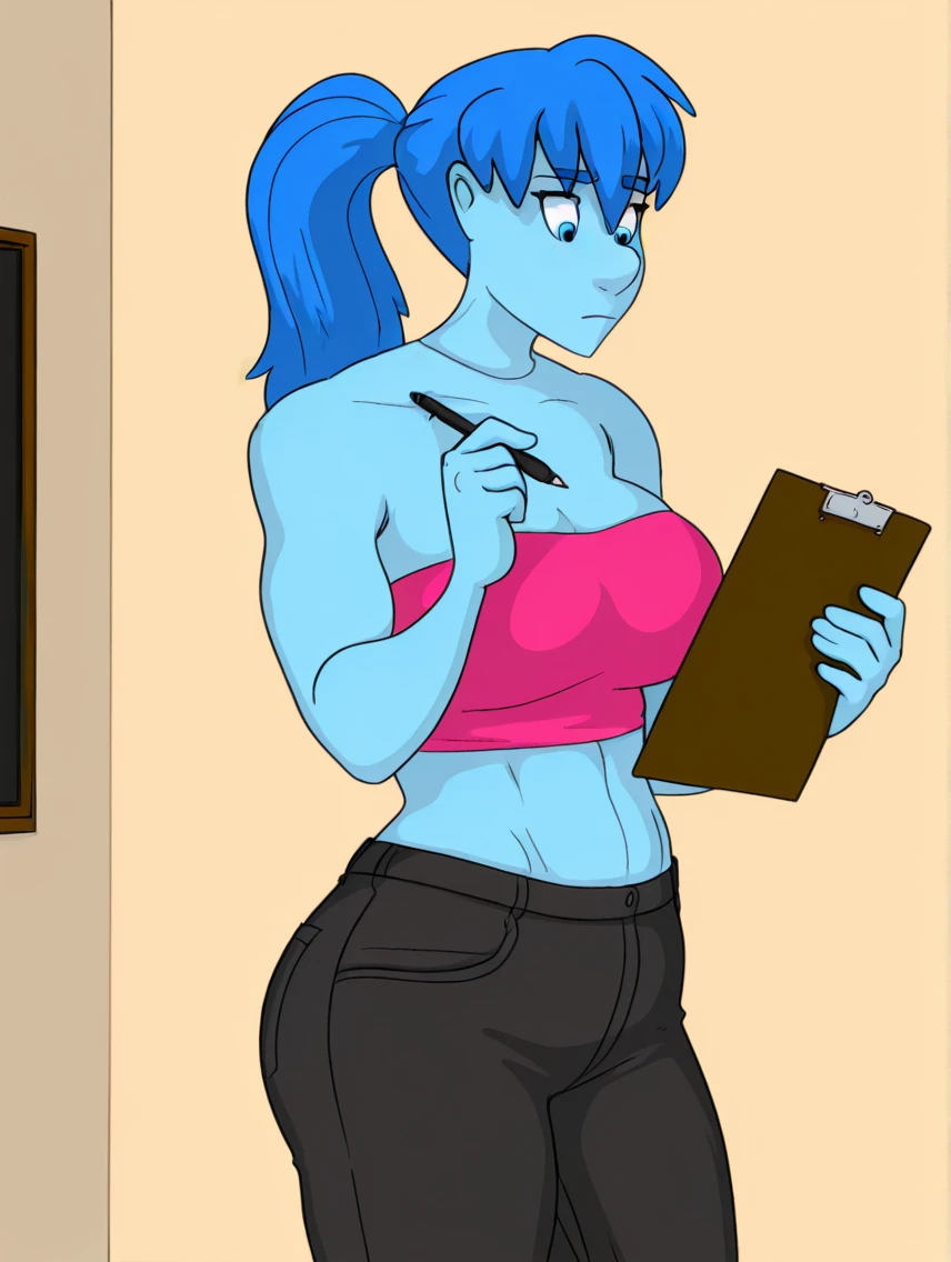 Recommended tags: "ai, light blue skin, blue hair, blue eyes, tall, fit, toned, very large breasts, neck seam, bangs." She tends to keep her hair in either a "very long ponytail" or "twintails" and has a variety of outfits.