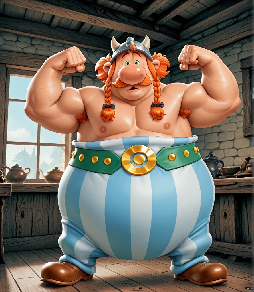 0B3L1X, toony, human, mature male, orange hair, mustache, two braids, caucasian, green eyes, big nose, obese, muscle