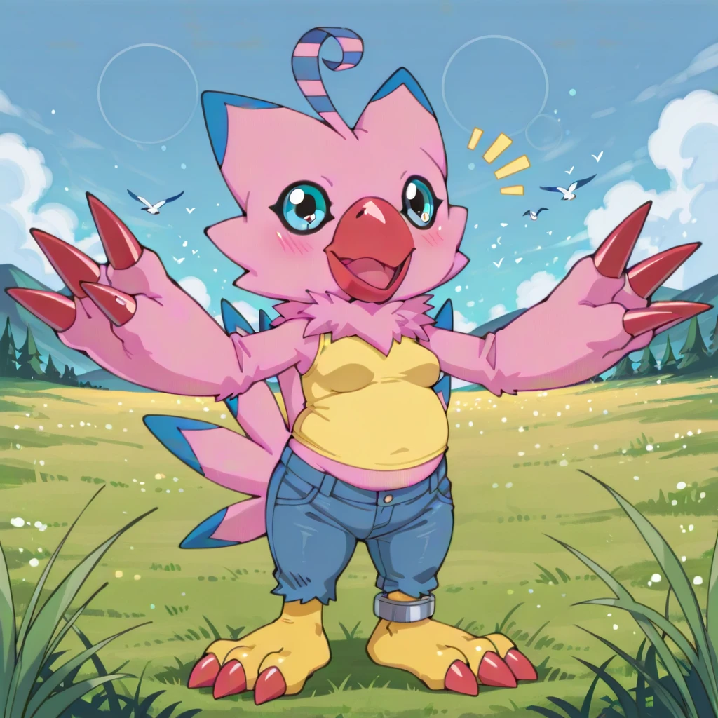bird_digimon female, solo, pink feathered body with blue accents, fluffy neck feathers, round light blue eyes, black eyeliner, curled pink ahoge with blue stripes, feather arms with three red finger claws, large feathered pink tail with blue accents, yellow feet with three red talons, one gray metal anklet on right ankle, chubby,