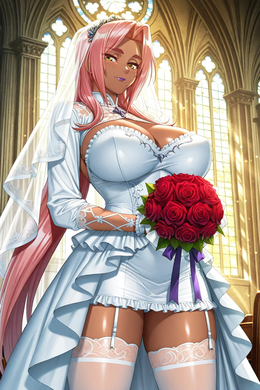 Ingrid, long hair, large breasts, navel, yellow eyes, pink hair, black gloves, black thighhighs, elbow gloves, black dress, armor, dark-skinned female, covered nipples, parted bangs, clothing cutout, black panties, makeup, turtleneck, hair intakes, thick eyebrows, lipstick, mole under mouth, thong, red cape, center opening, highleg panties, nipple slip, purple lips