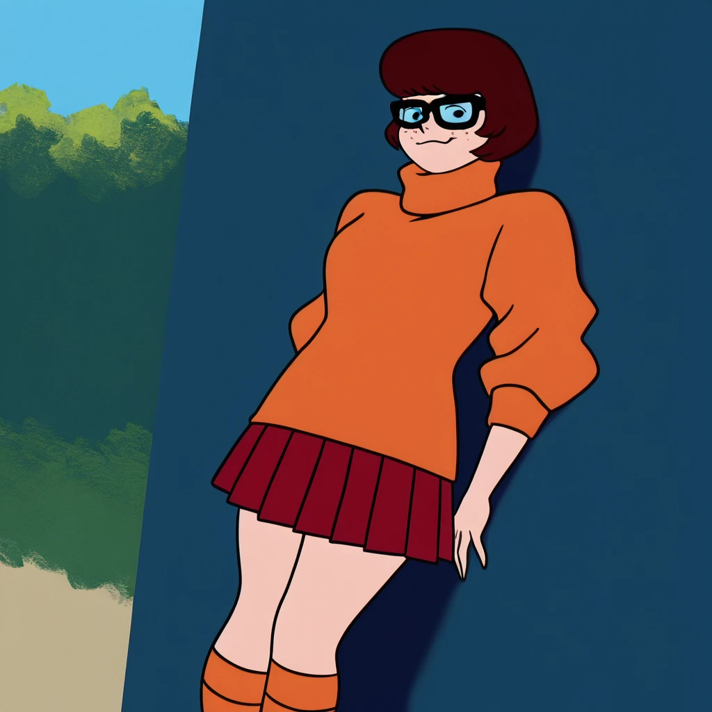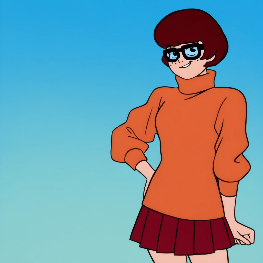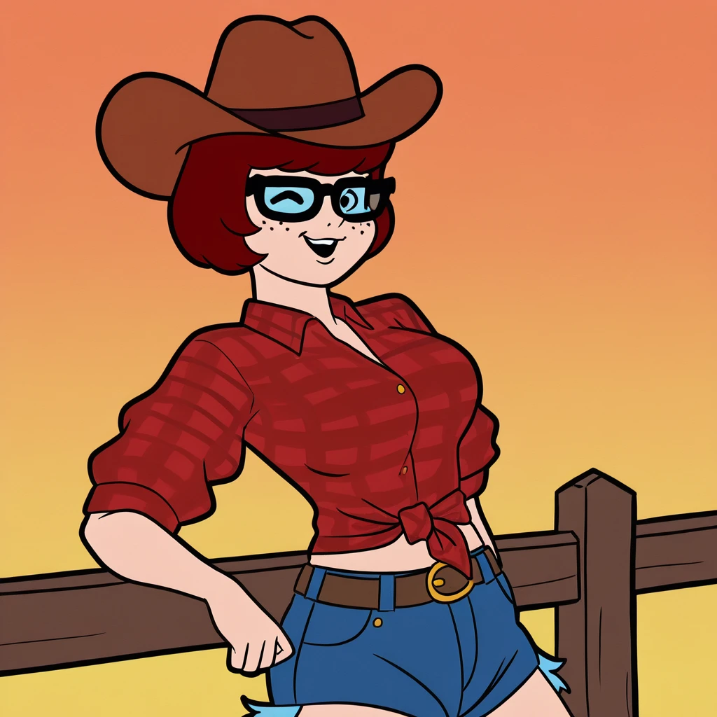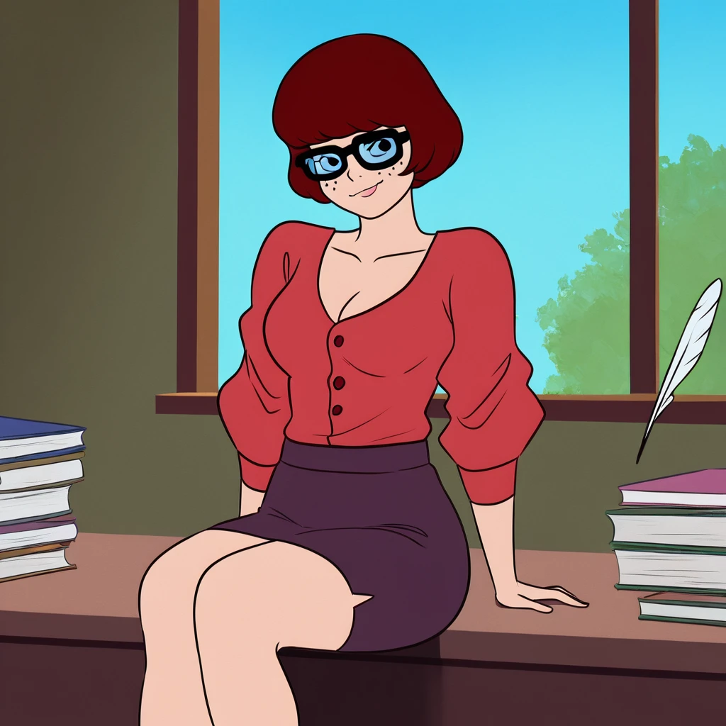 red hair, freckles, glasses, bob cut, (orange turtleneck sweater, red pleated skirt, orange kneehigh socks)
