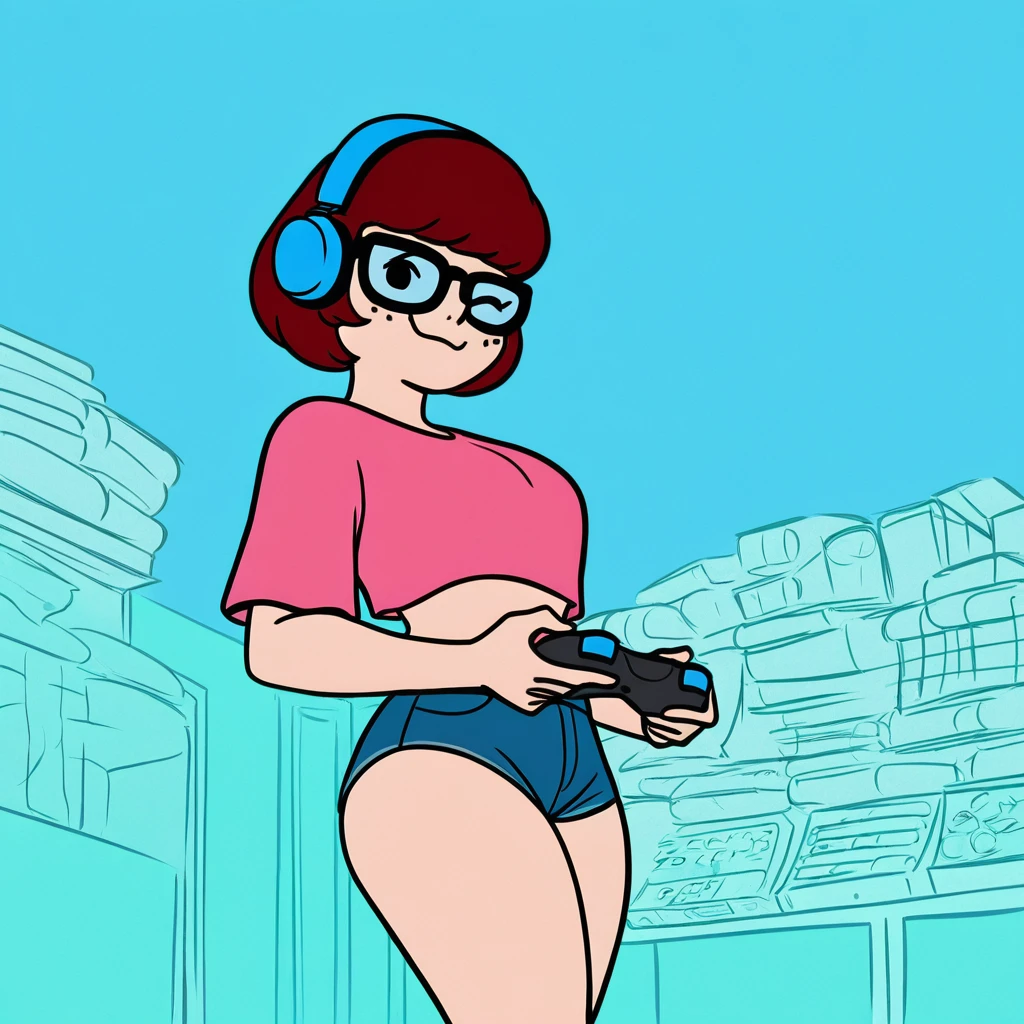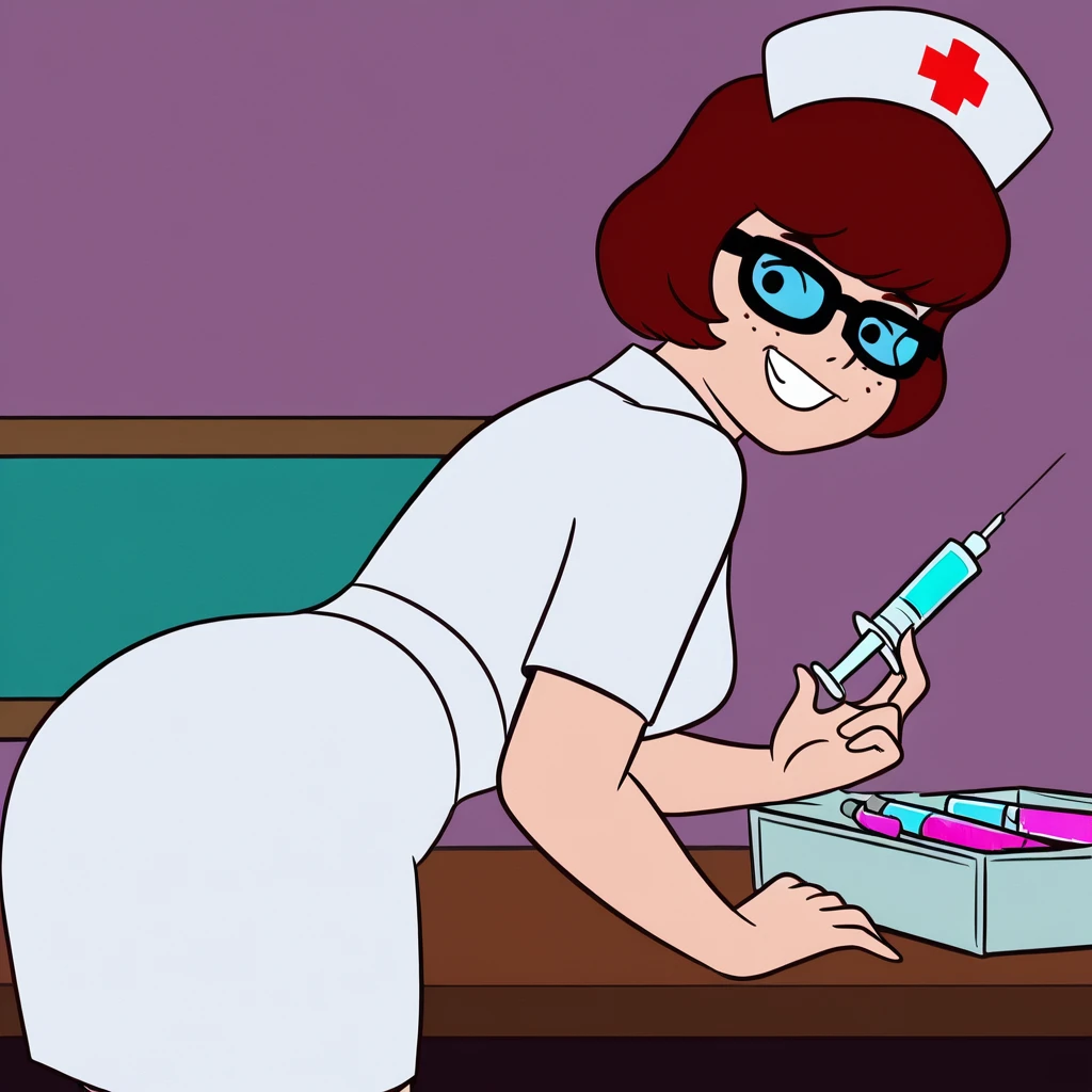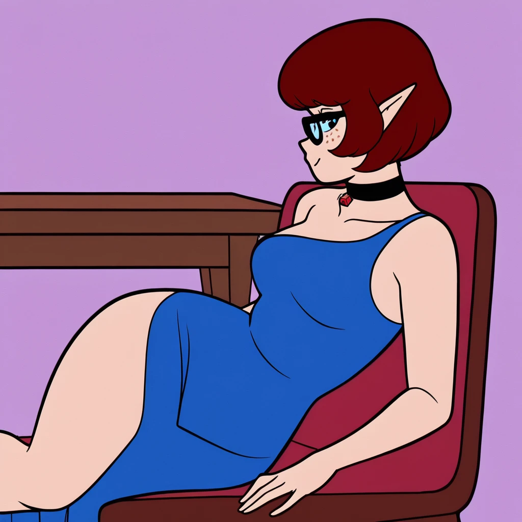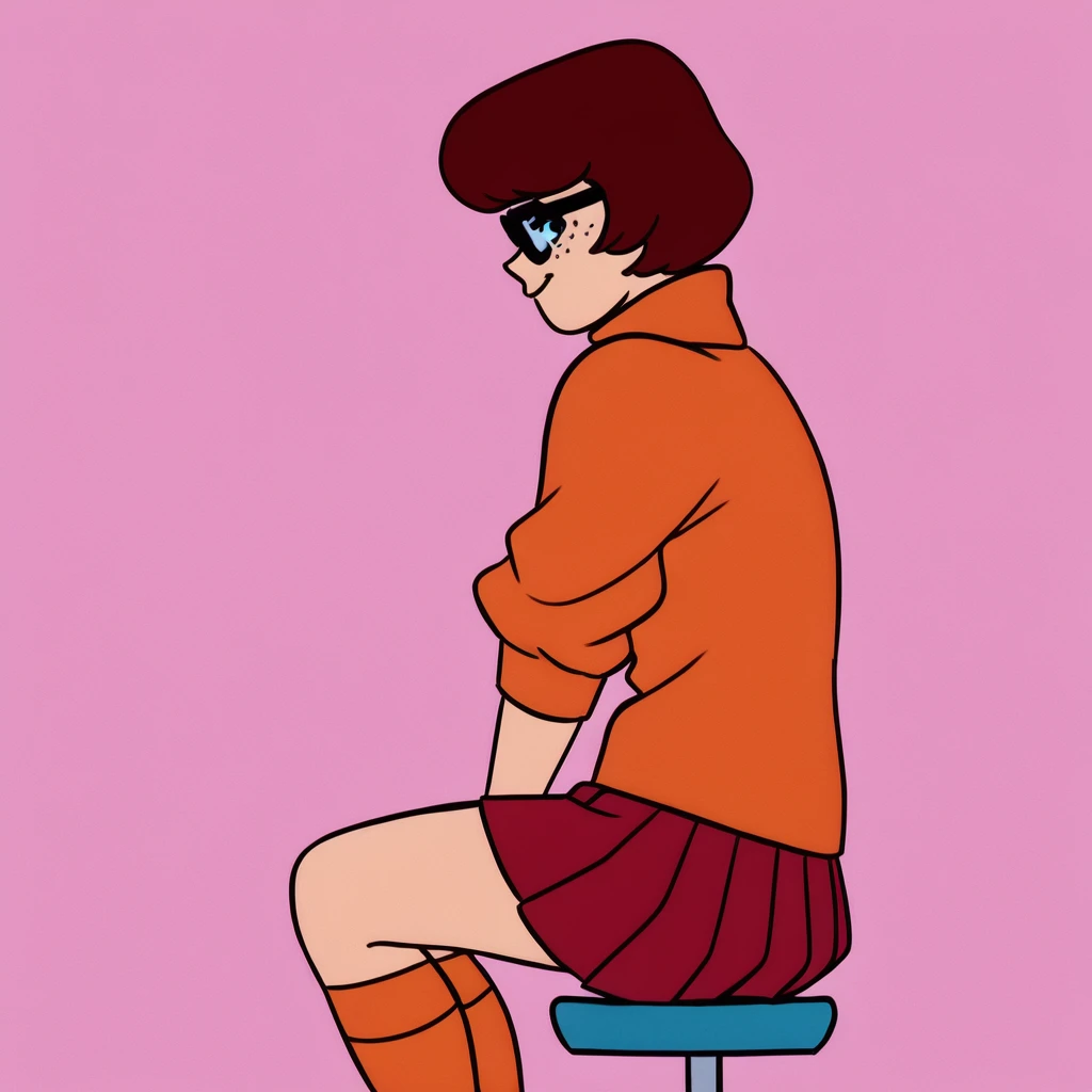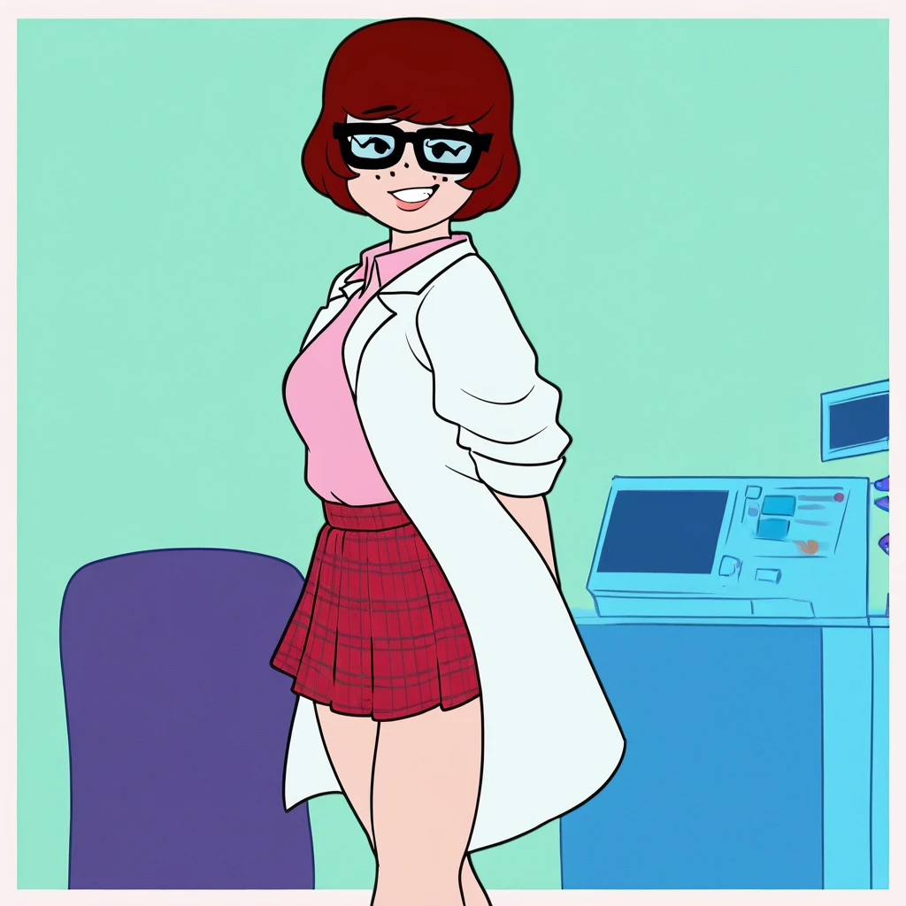 red hair, freckles, glasses, bob cut, (orange turtleneck sweater, red pleated skirt, orange kneehigh socks)