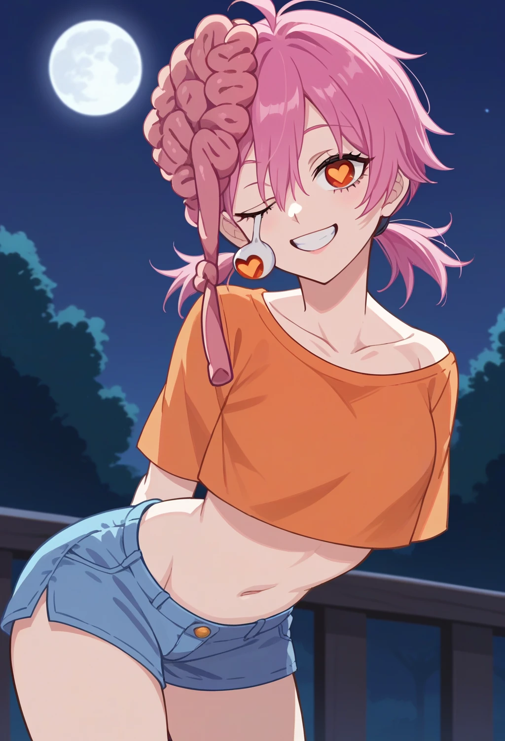 pink hair, short hair, low twintails, hair between eyes, heart-shaped pupils, orange eyes, one eye closed