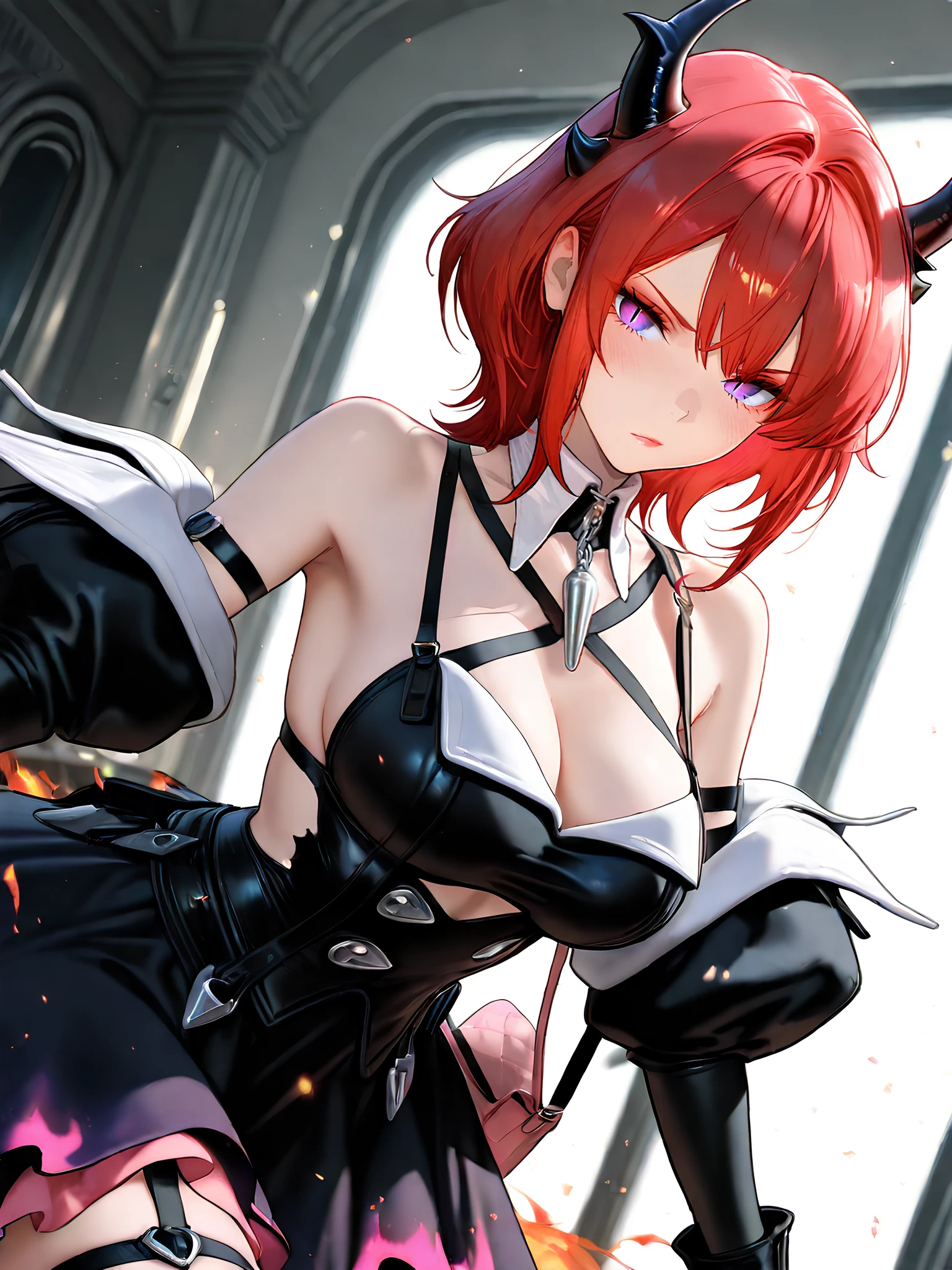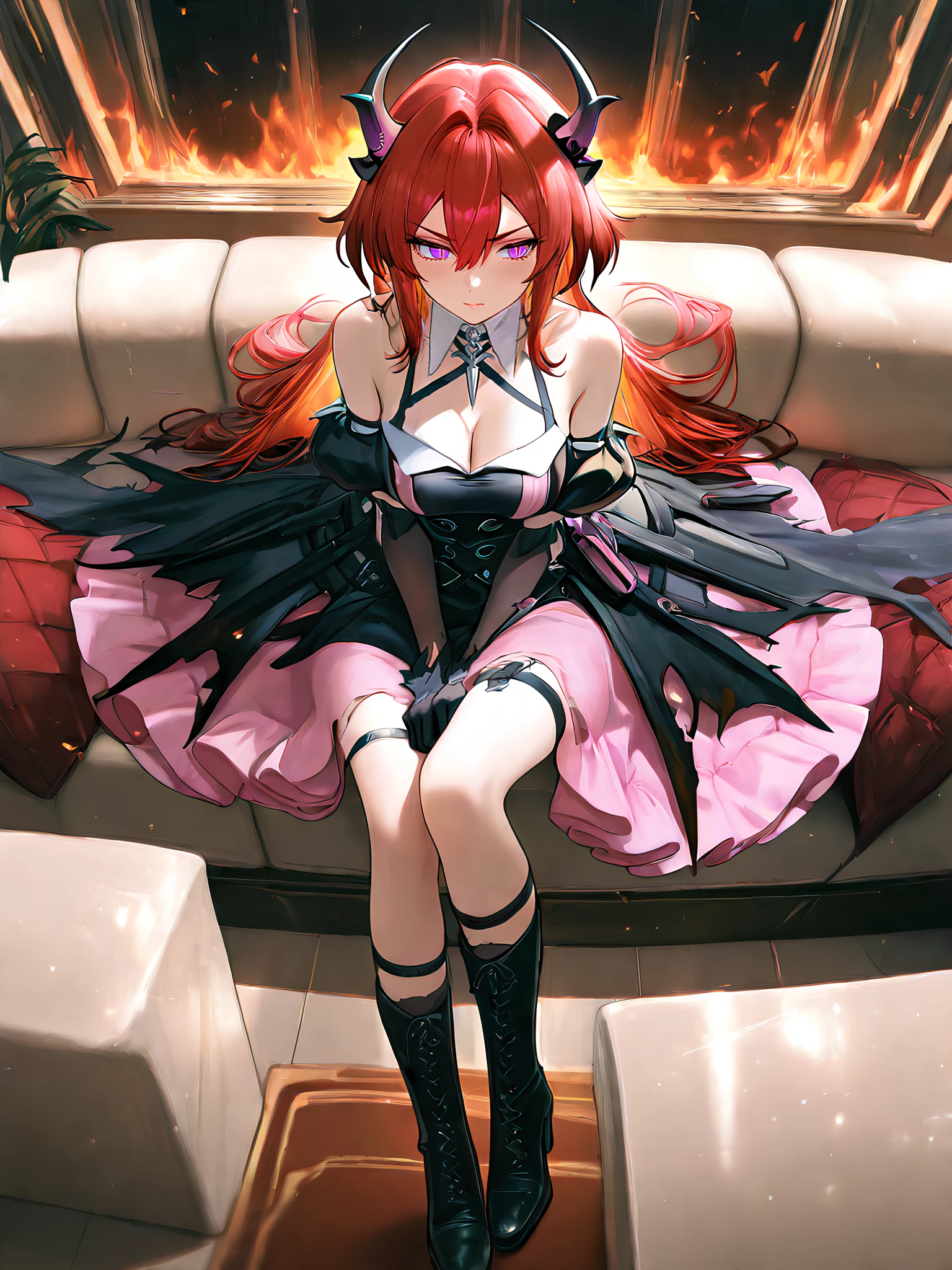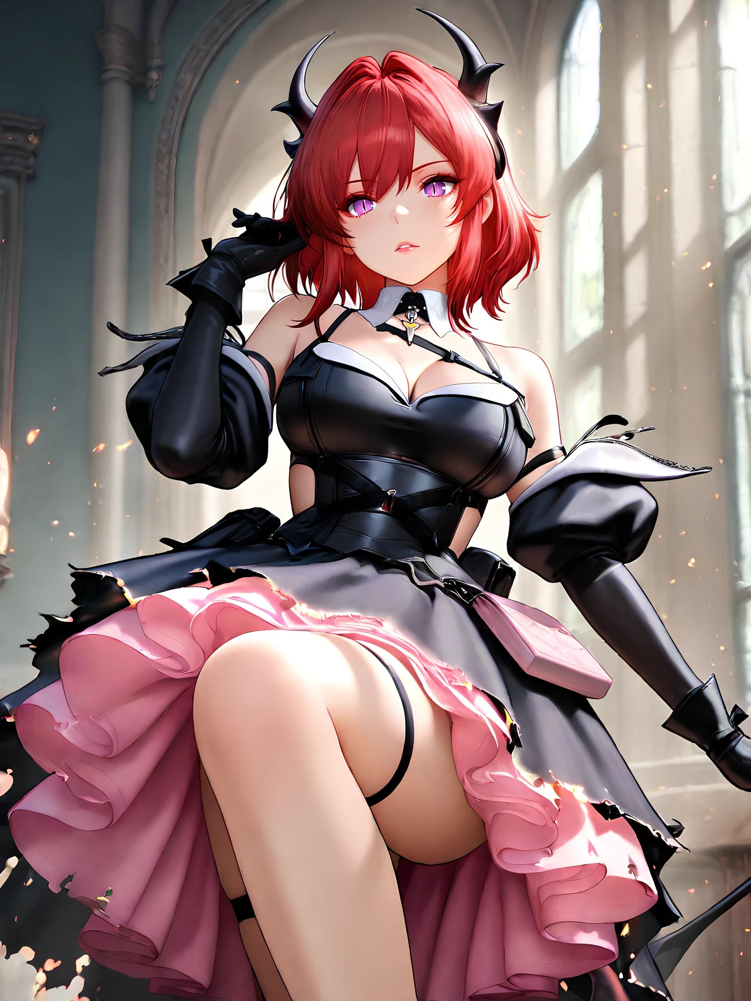 Full: laevatain, purple eyes, red hair, demon horns, slit pupils, lipstick, laevatain costume, metal pendant, chest straps, shoulder cut,cleavage, black dreess, black gloves, detached collar, thigh strap, long floating dress, pink dress interior, pink purse, dress decorations, double-layered dress, the outer layer of the dress is black, the inner is pink, the lower edges of the outer black layer of the dress are burnt and torn, thigh straps, elbow gloves, detached sleeves, chest strap.