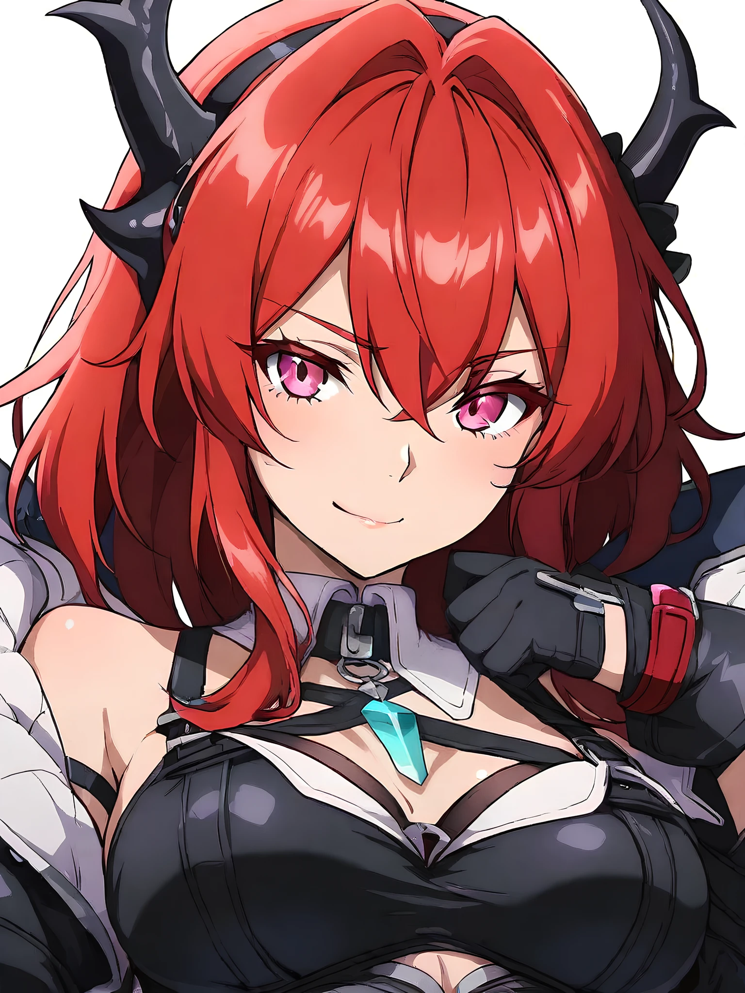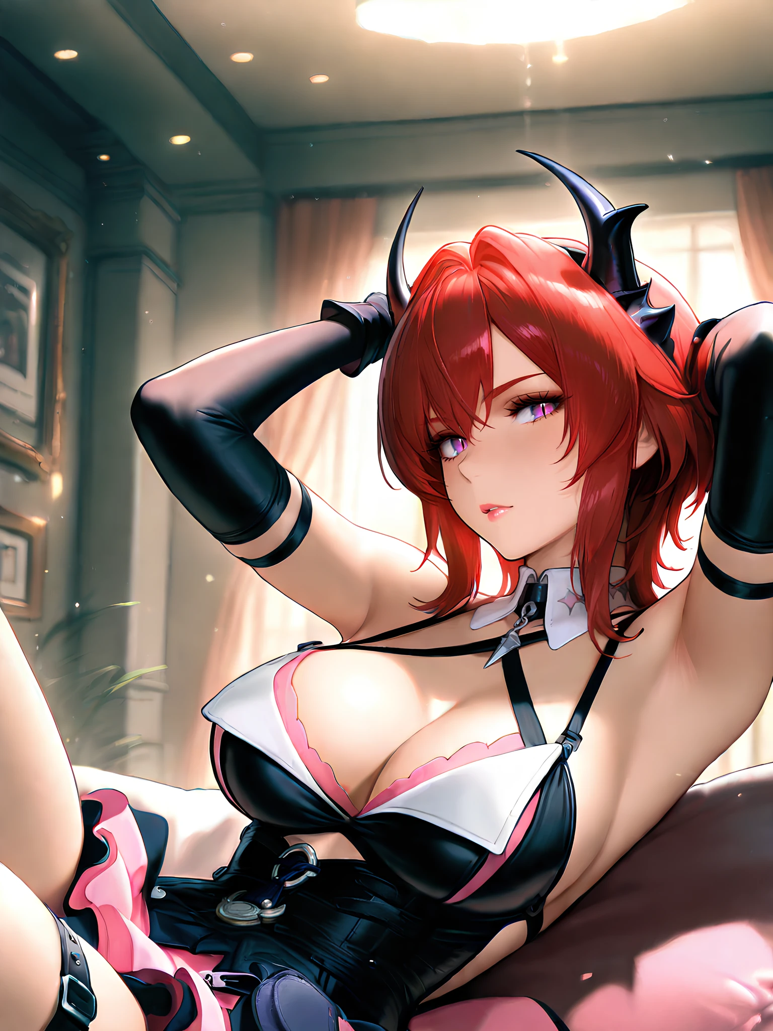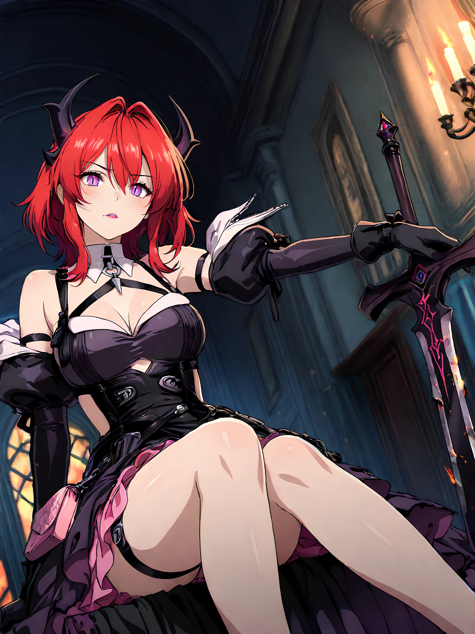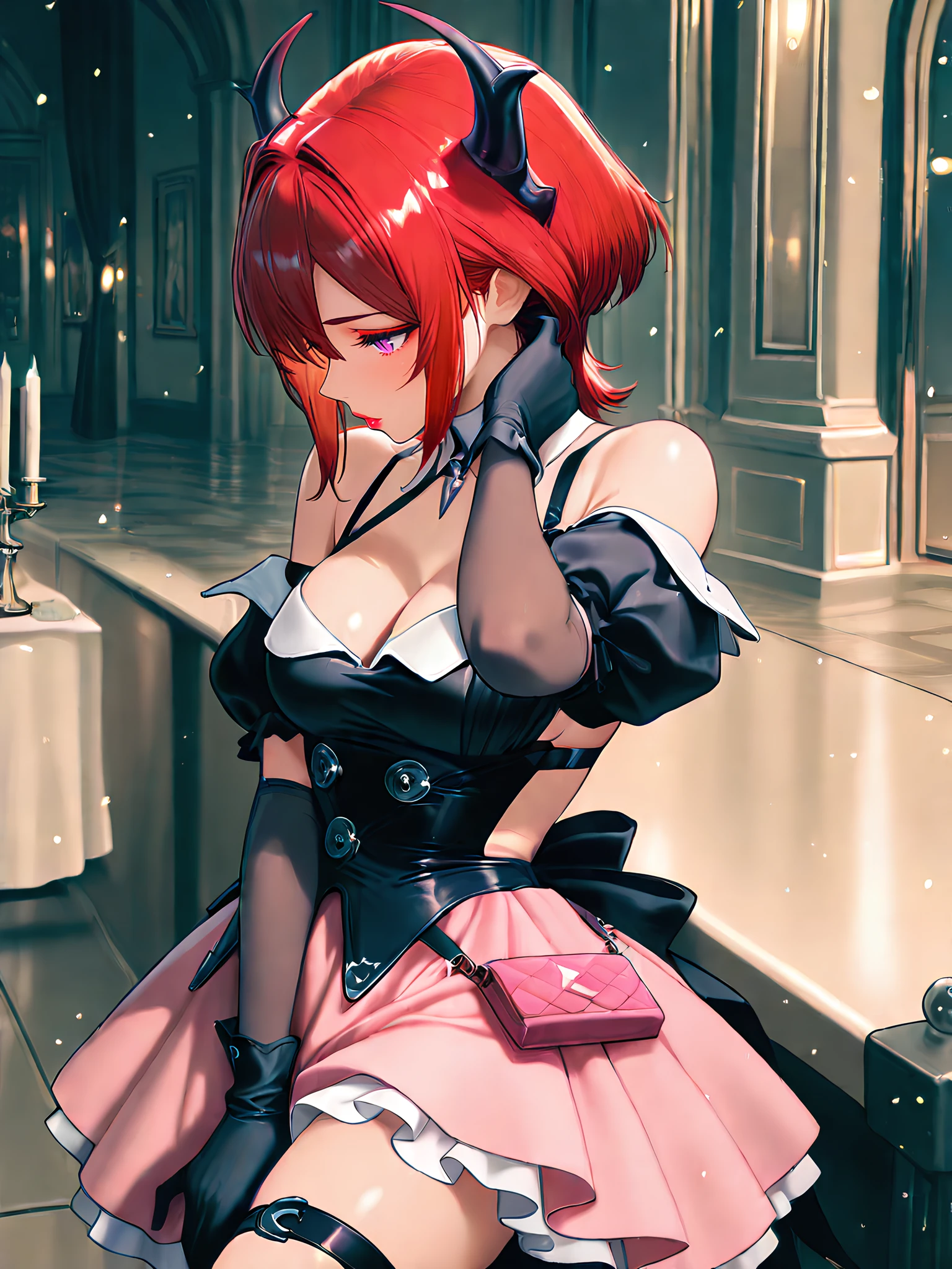 Full: laevatain, purple eyes, red hair, demon horns, slit pupils, lipstick, laevatain costume, metal pendant, chest straps, shoulder cut,cleavage, black dreess, black gloves, detached collar, thigh strap, long floating dress, pink dress interior, pink purse, dress decorations, double-layered dress, the outer layer of the dress is black, the inner is pink, the lower edges of the outer black layer of the dress are burnt and torn, thigh straps, elbow gloves, detached sleeves, chest strap.