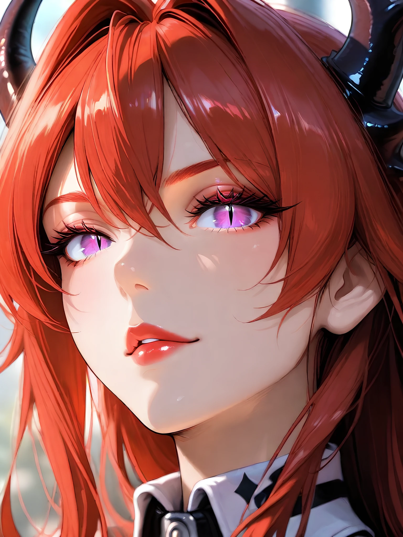 Appearance: laevatain, purple eyes, red hair, demon horns, slit pupils, lipstick.