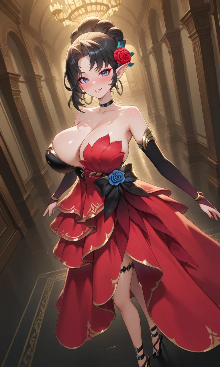 Lucy(SK), black hair, Bun hair, parted bangs, blue eyes, red eyeshadow, pointy ears, hoop earrings, red rose hair ornament, black choker, red dress, black sleeve protector, black decorations, black leg tattoo, black ankle strap, black high heels,