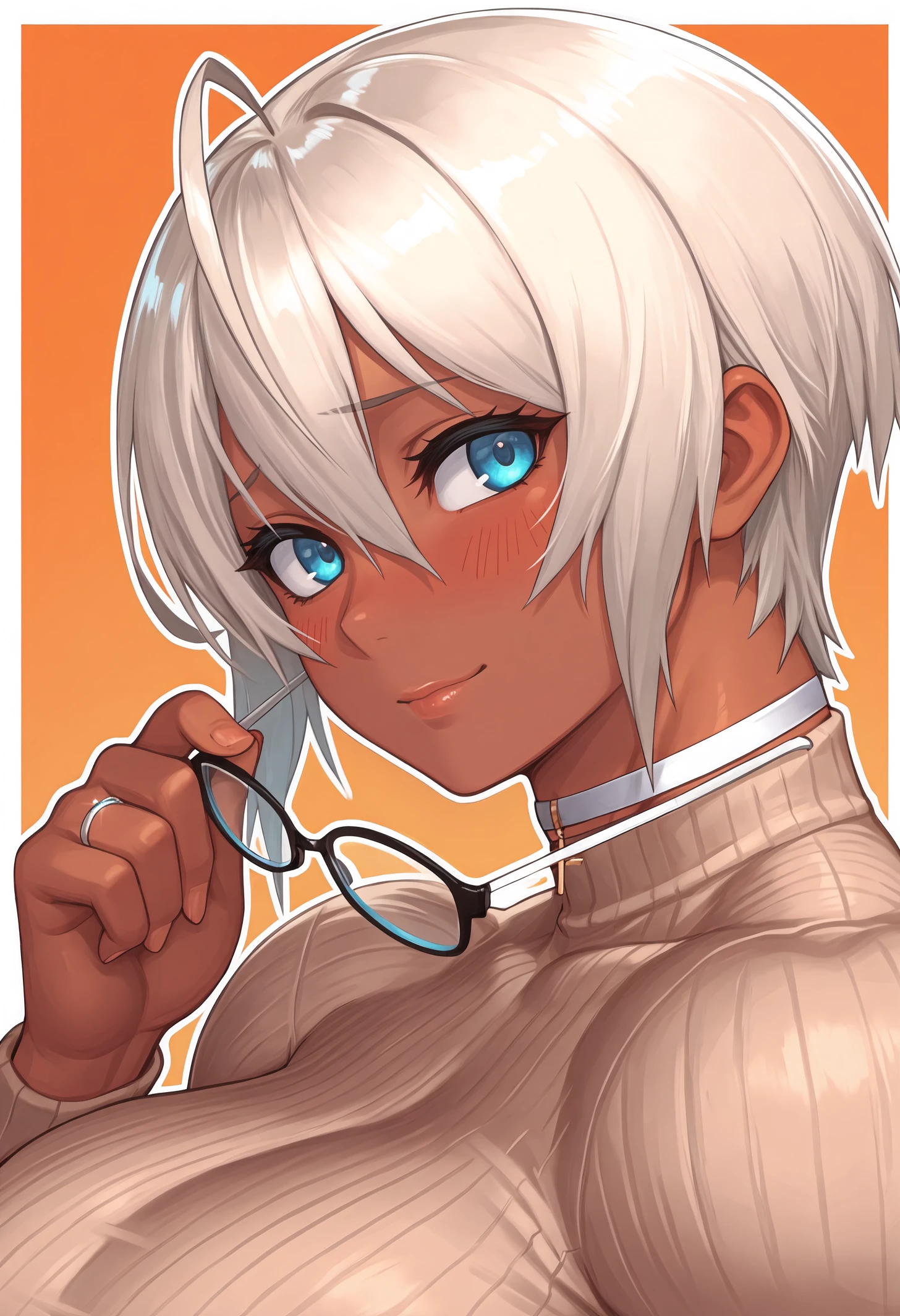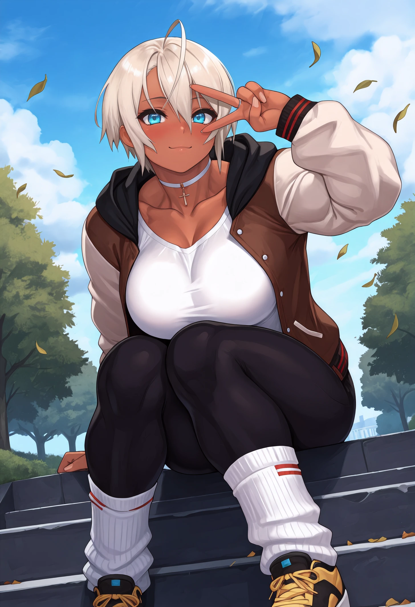 Always needed: "dark-skinned female, blue eyes, short hair, ahoge, platinum blonde hair, hair between eyes, large breasts, muscular female" always needed.