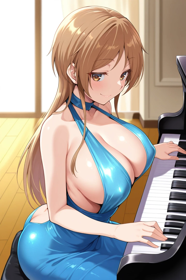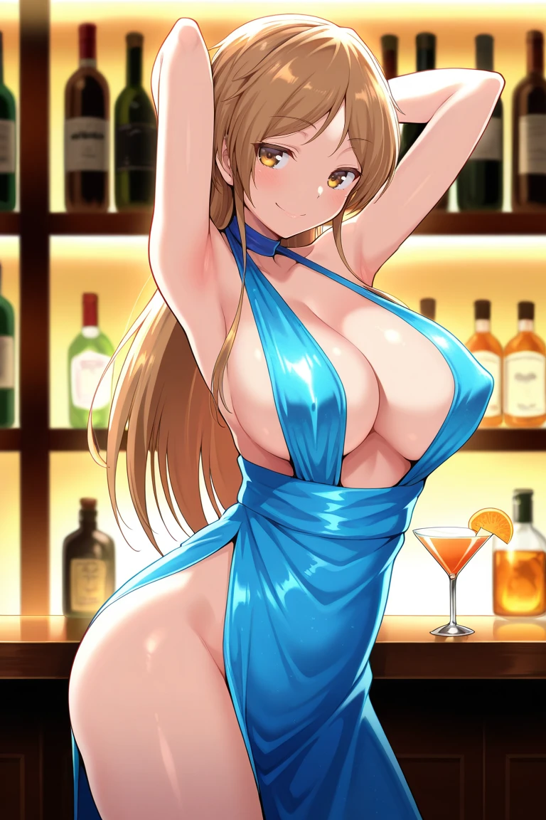 arisa-dress, blue dress, halterneck, bare shoulders, backless dress, plunging neckline, cleavage, sideboob, slit dress,