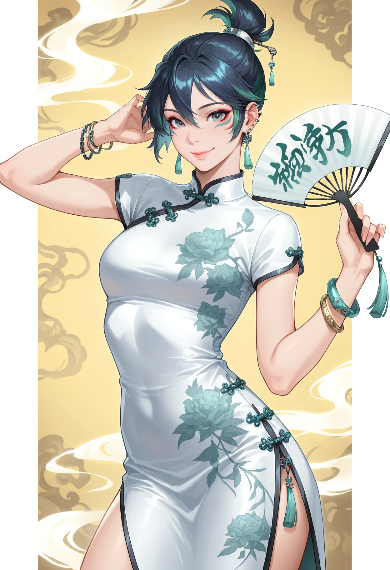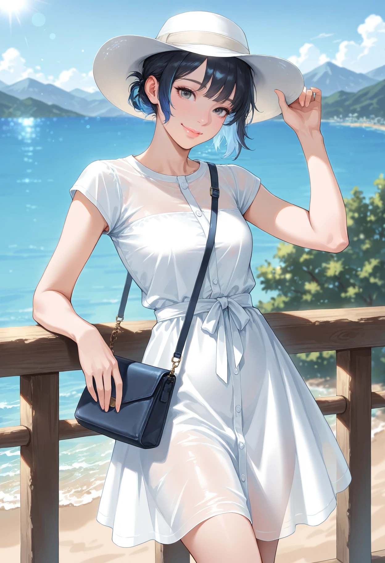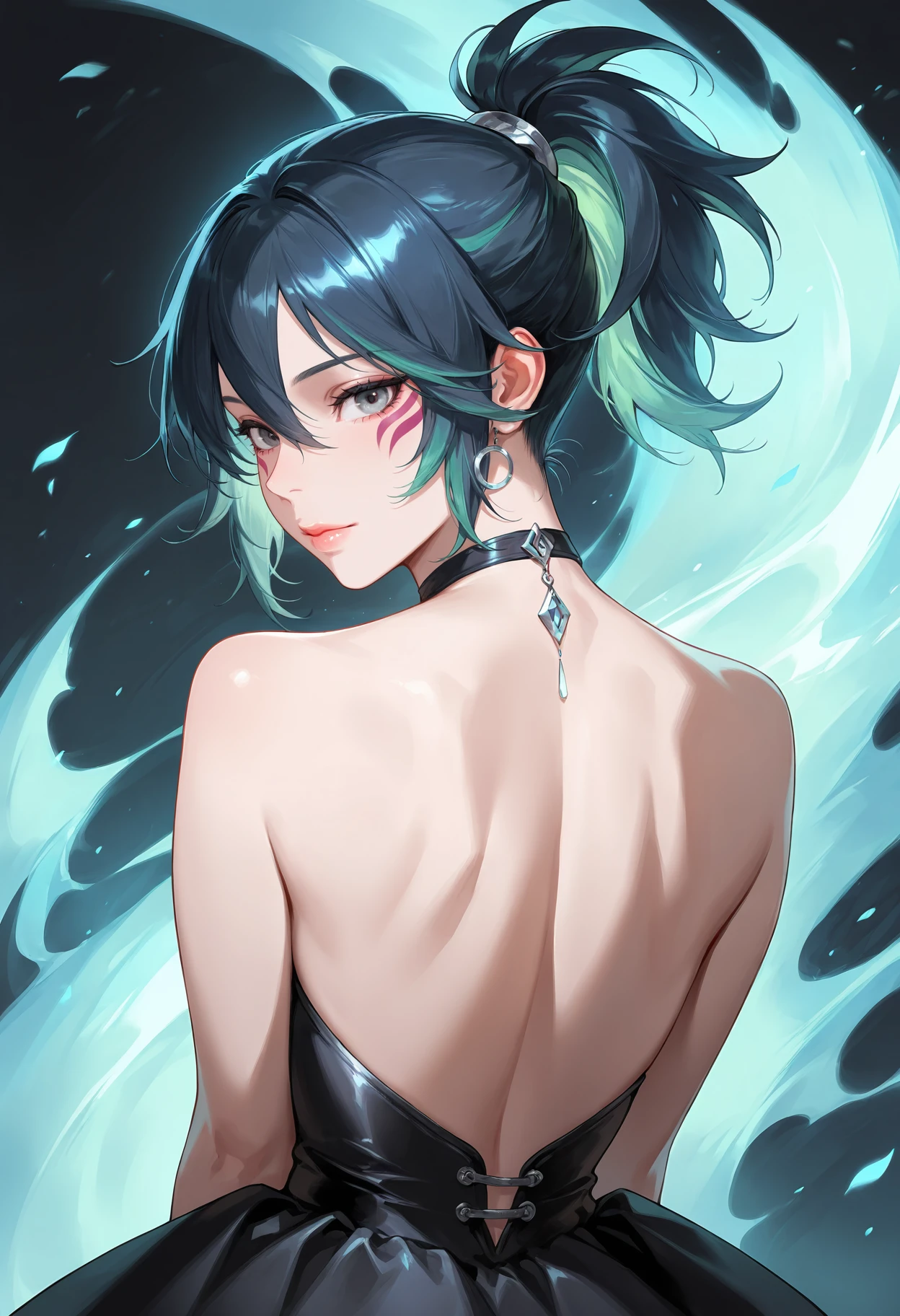 1girl,black eyes,grey eyes,lips,black hair,blue hair,multicolored hair,short hair,bangs