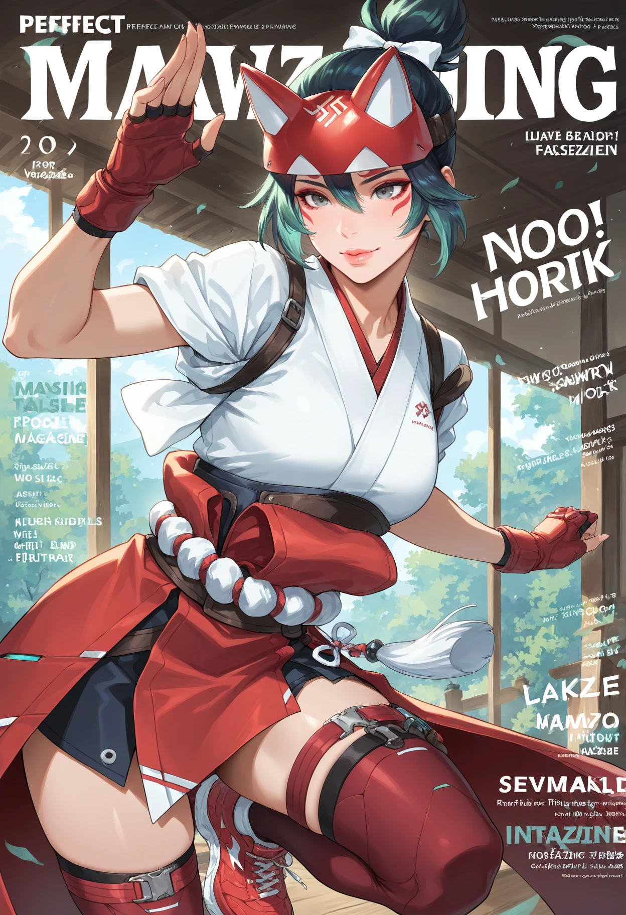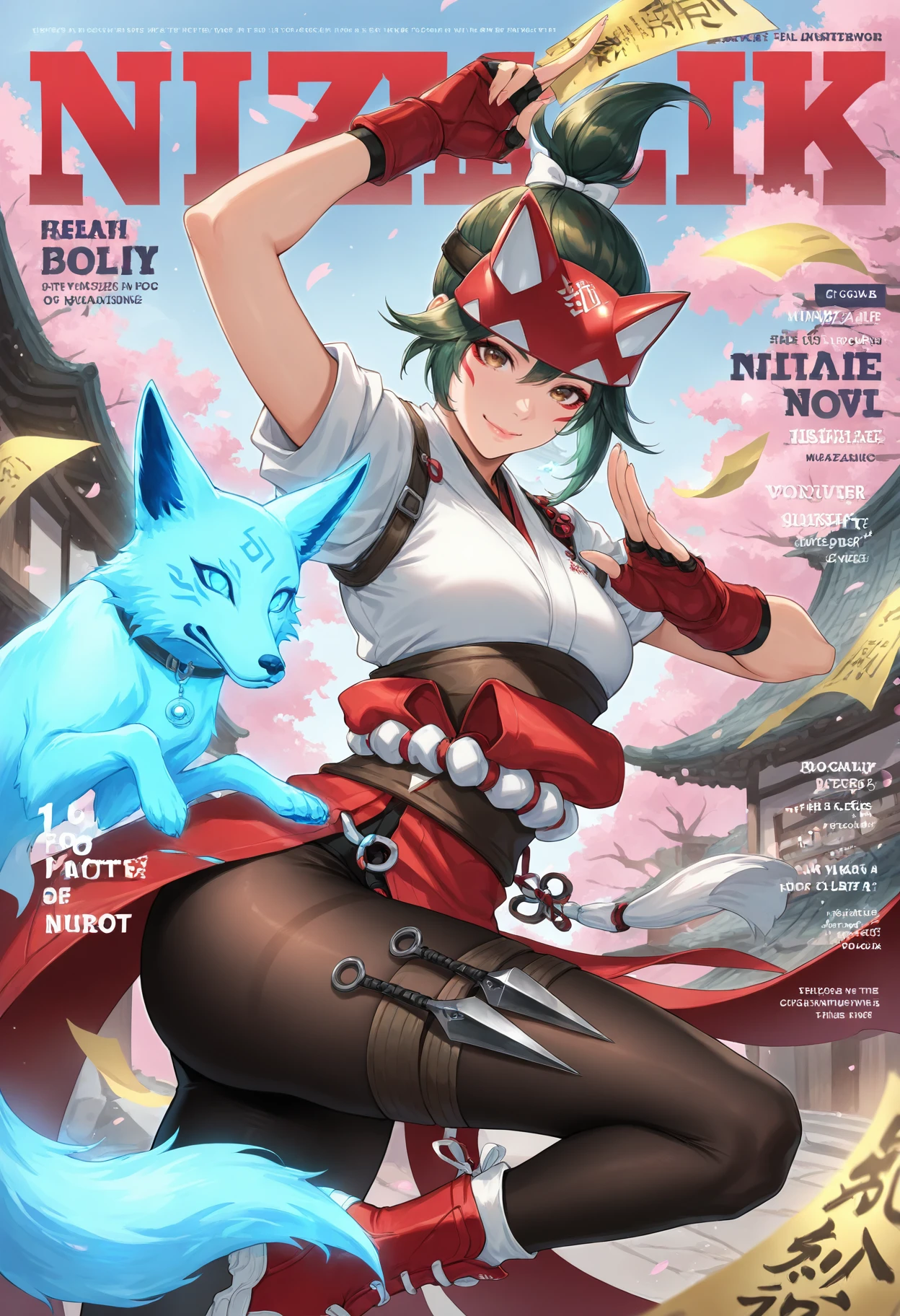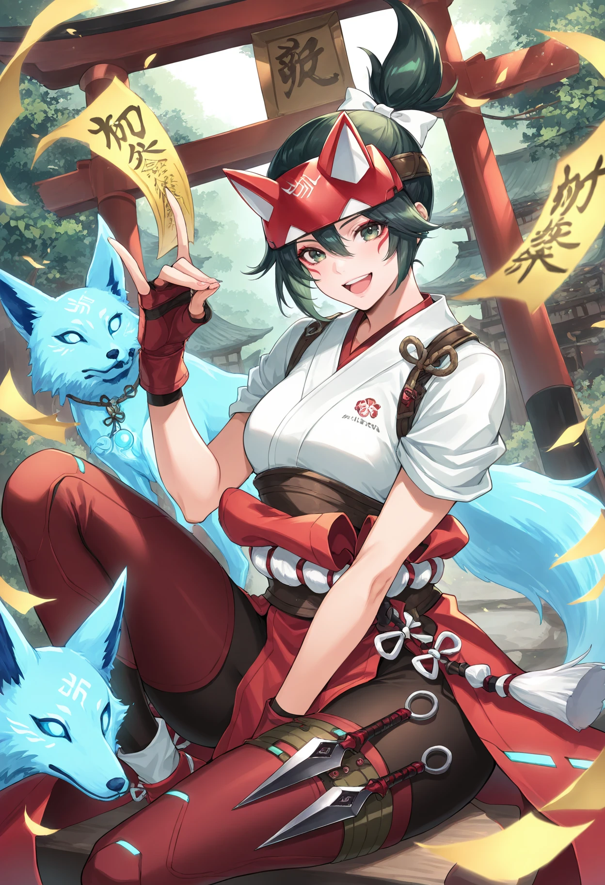 green hair,hair between eyes,facepaint,facial mark,medium hair,high ponytail,mask,fox mask,mask on head,hair bow,japanese clothes,white kimono,red footwear,shoes,kimono,gloves,red gloves,hakama,bow,white bow,skirt,fingerless gloves,red hakama,hakama skirt,topknot,sleeveless kimono,short sleeves,thighhighs,breasts,miko,thigh strap,sneakers