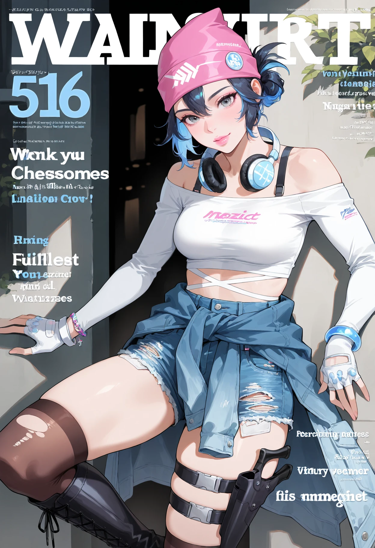 pink lips,hat,pink headwear,purple headwear,bandana,headphones,headphones around neck,goggles around neck,mask around neck,bracelet,jewelry,ofuda,jacket,sweater,shirt,white shirt,off shoulder,off-shoulder shirt,crop top,bare shoulders,long sleeves,gloves,white gloves,fingerless gloves,elbow gloves,clothes around waist,jacket around waist,sweater around waist,shorts,short shorts,denim shorts,blue shorts,denim,holster,thigh strap,thighhighs,brown thighhighs,kneehighs,boots,knee boots,lace-up boots,cross-laced footwear,black footwear,torn clothes,breasts,medium breasts,alternate costume
