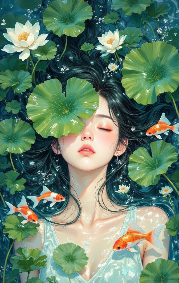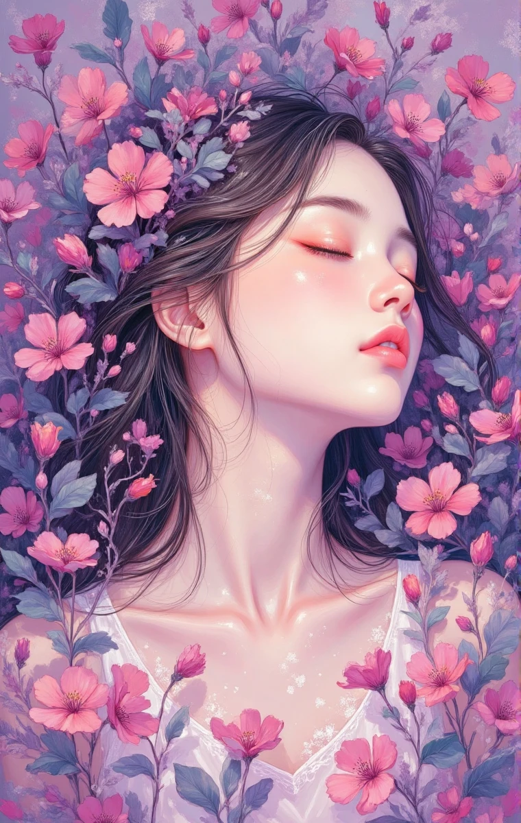 This painting is a dreamy and beautiful illustration work, with blue and purple as the main colors, creating a peaceful and romantic atmosphere. The woman closed her eyes, her face was soft and graceful, surrounded by flowers. Her hair intertwined with the flowers, and her petals fluttered lightly. The light dots shone like stars, blending the characters with nature, conveying a peaceful and beautiful atmosphere, as if she were a sleeping elf in the flowers, showing off her softness and dreams.