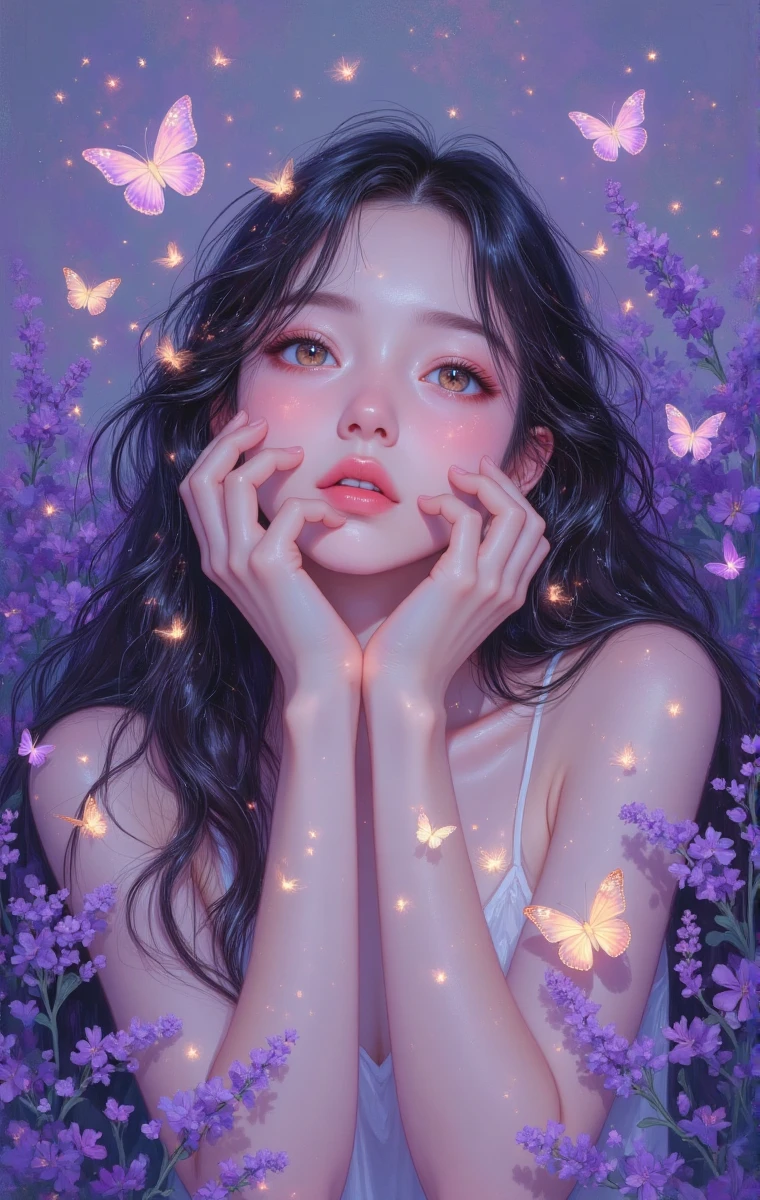 This painting is a dreamy style illustration, with purple as the main tone, creating a romantic atmosphere. The long haired woman holds her cheeks, surrounded by glowing butterflies and purple flowers, with shimmering light and shadow, and her skin resembling starlight. She blends the softness and fantasy elements of a young girl, conveying an ethereal and beautiful atmosphere, like an elf walking out of a fairy tale, fully displaying dreams and poetry.