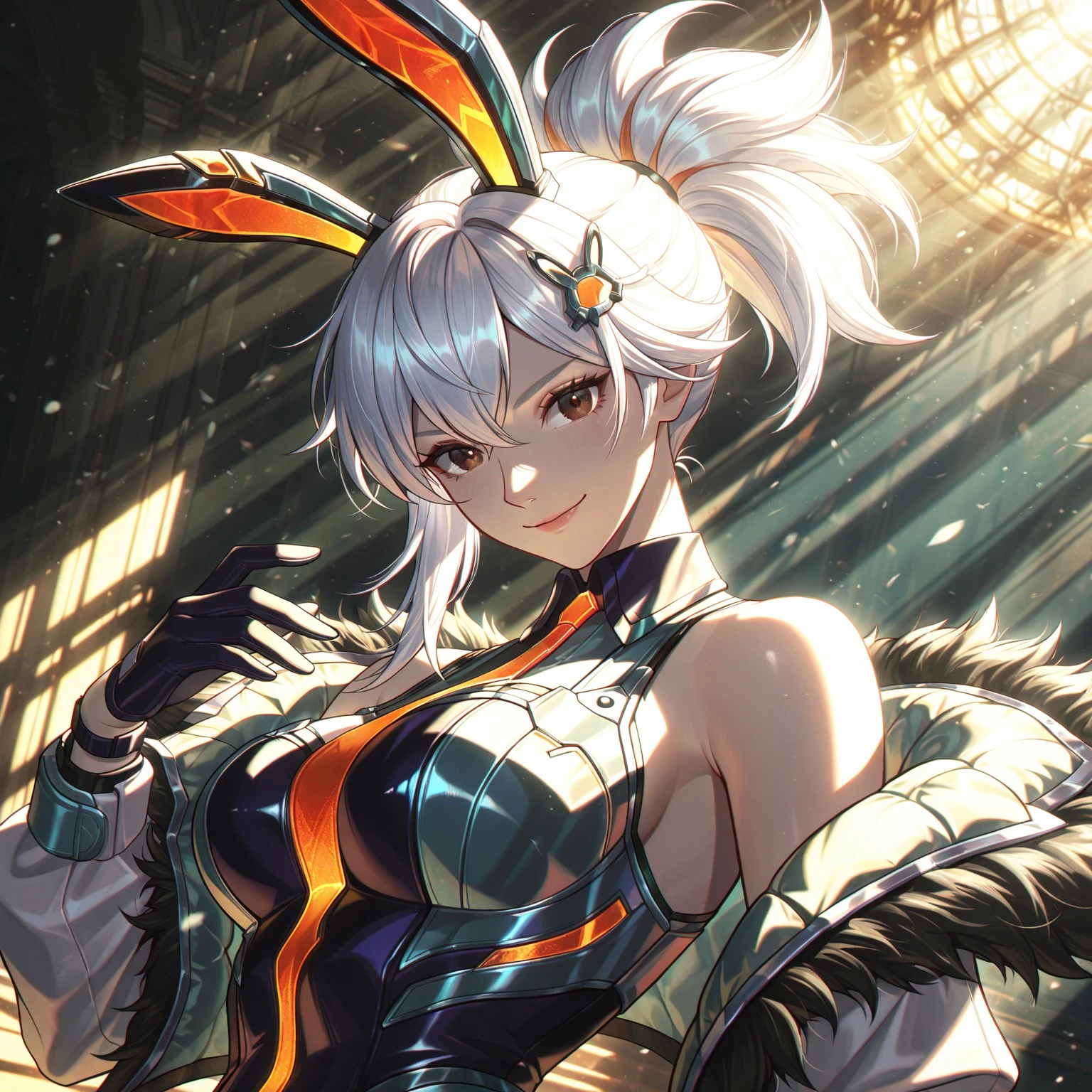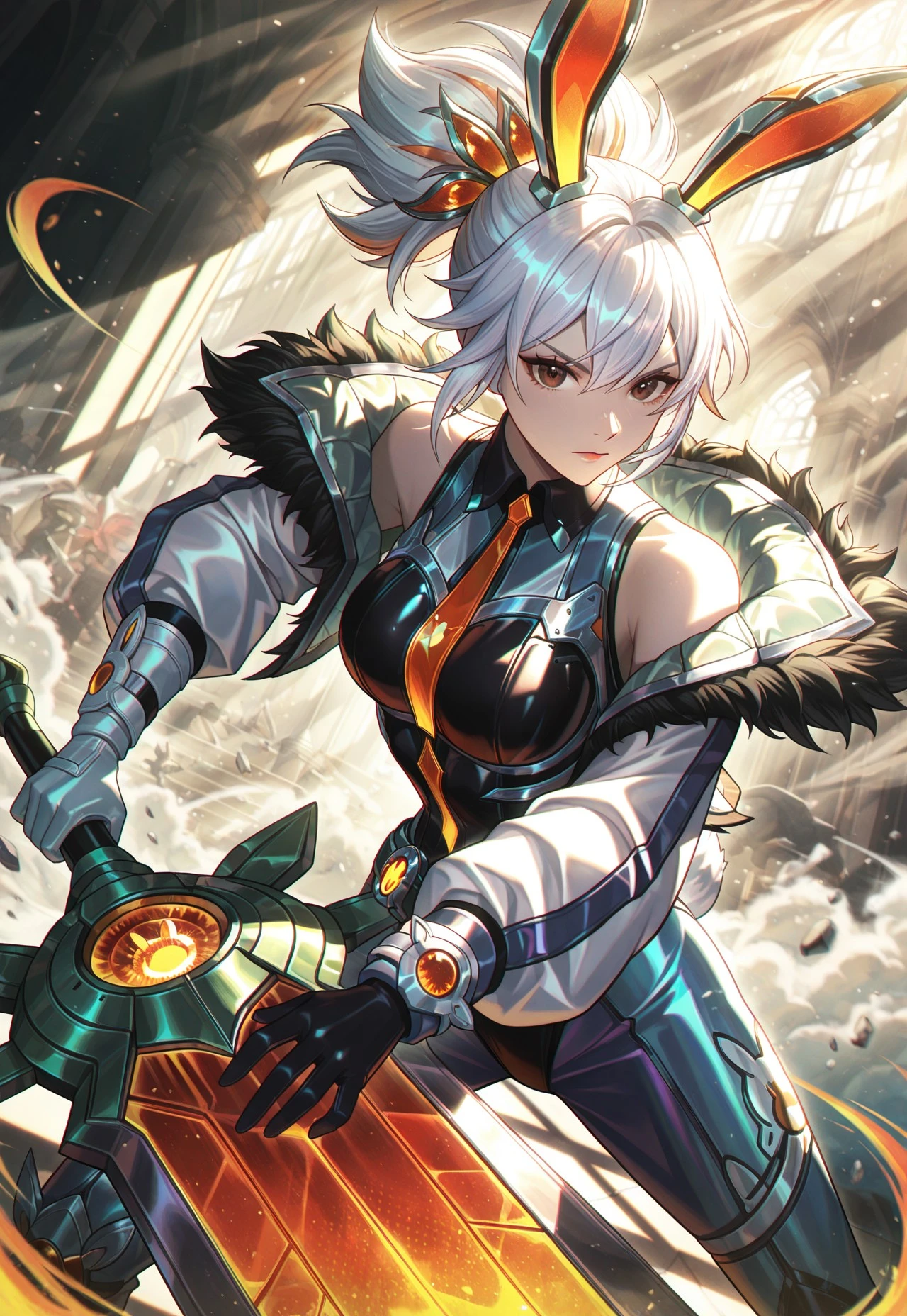 BBPriven, medium hair, white hair, high ponytail, hair ornament, ears, brown eyes, fur trim, open jacket, shoulders, multicolored , glove, greatsword, holding a greatsword,
