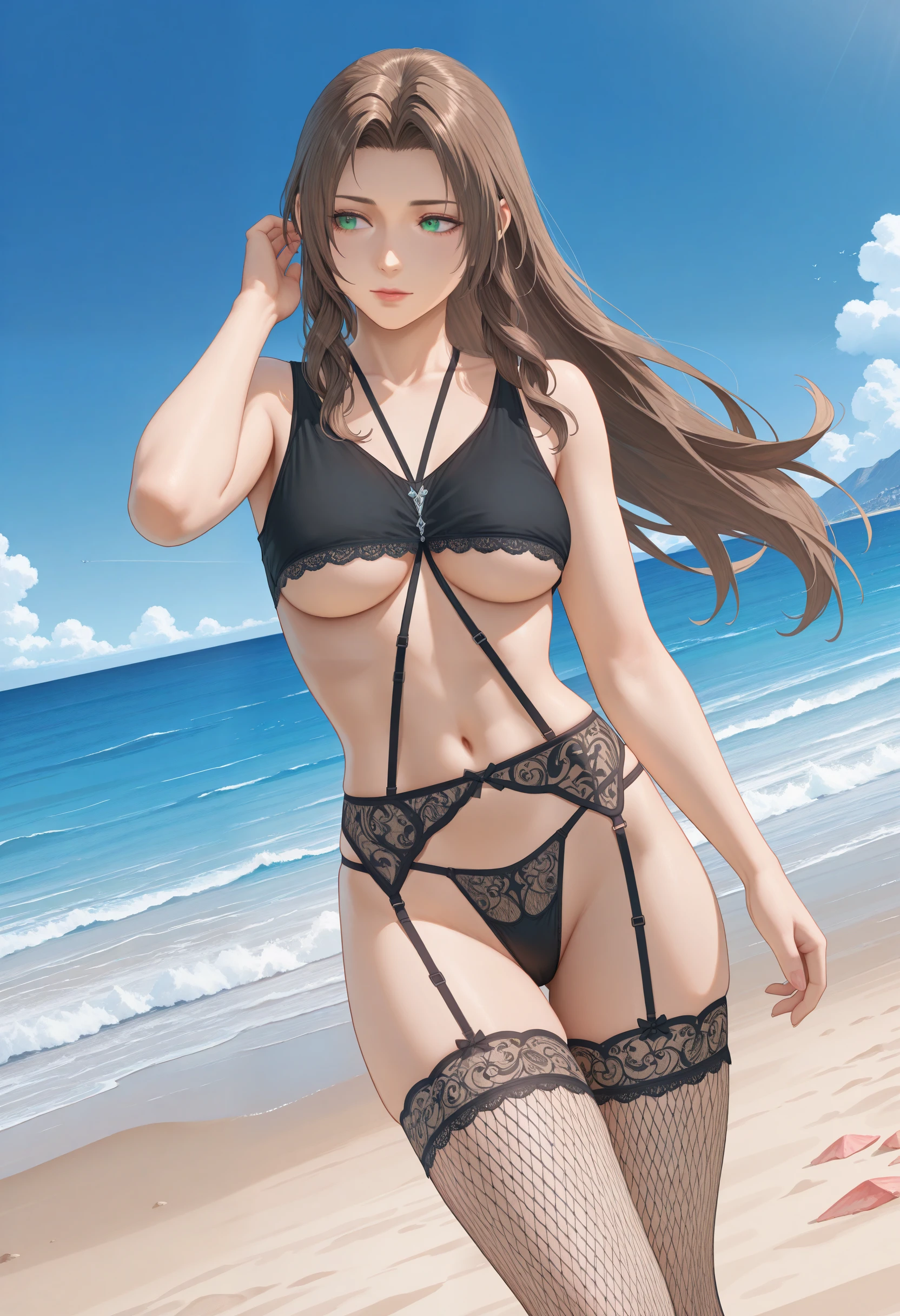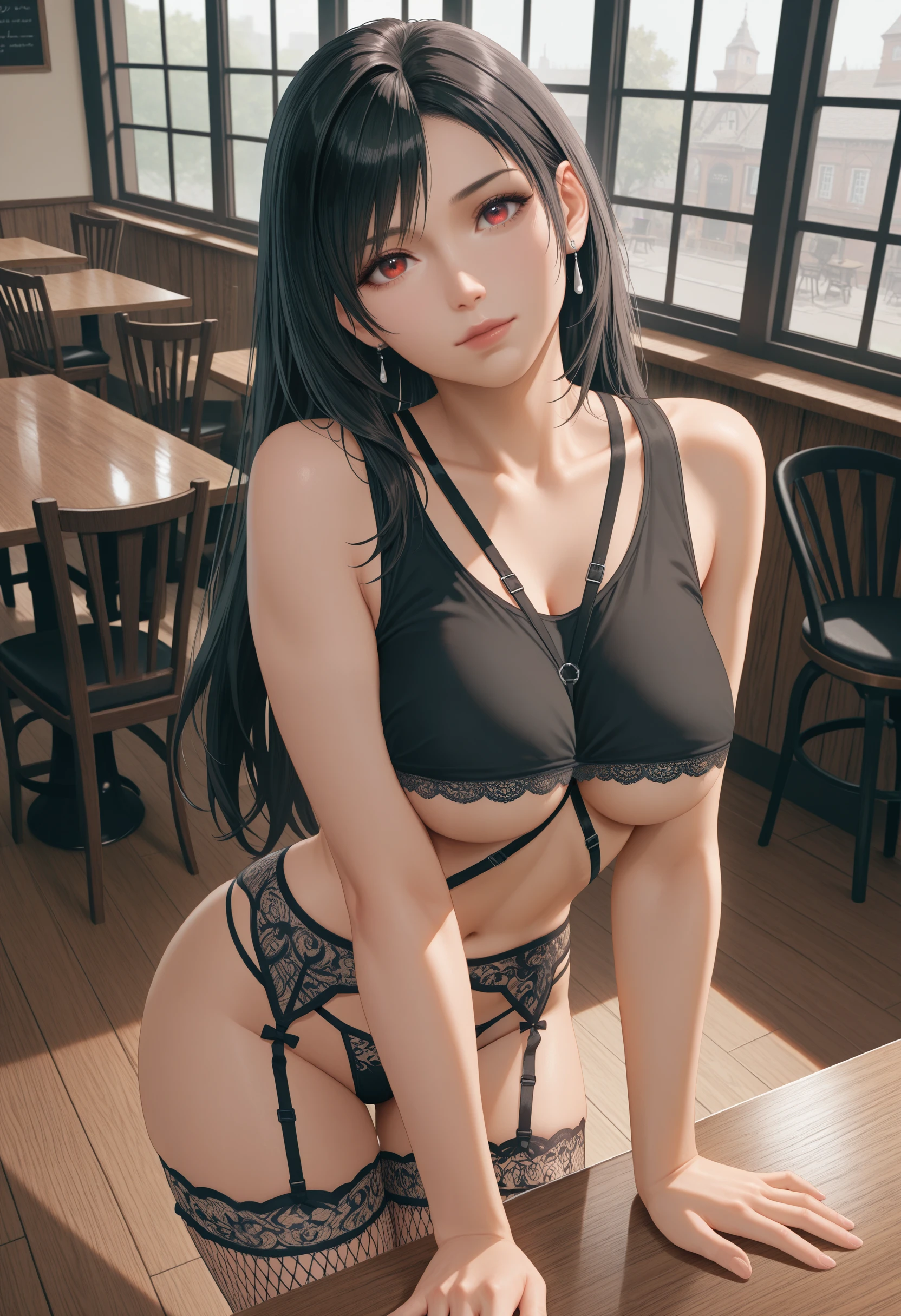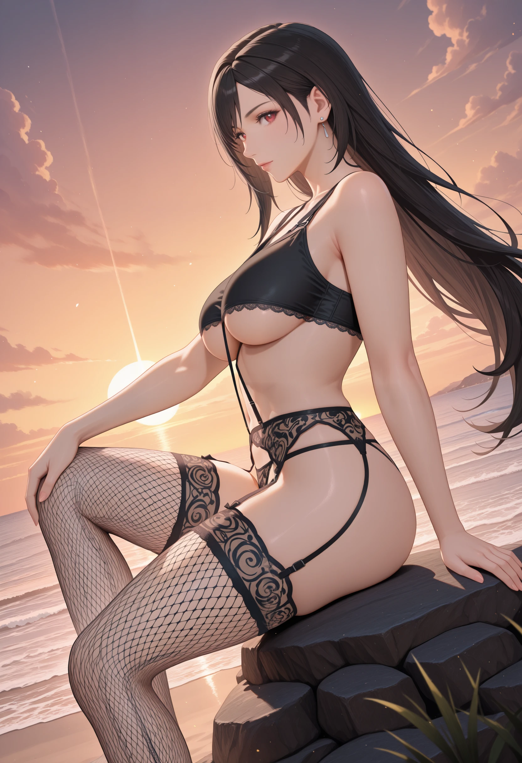 Basic prompt: "MidnightClams_doaxvv,black clothes,underboob,lace trim,crossed thong,crossed strap,jewelry,garter belt,garter straps,lingerie,black panties,fishnet thighhighs".