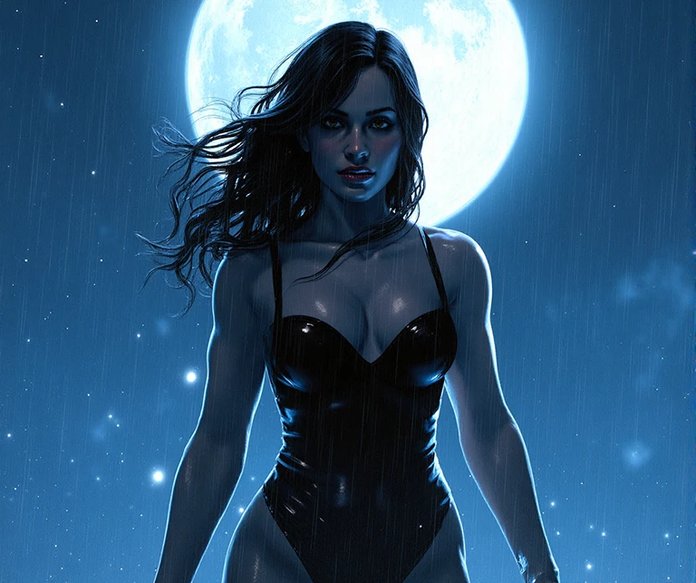 is depicted in mid-action. the image is a highly detailed. realistic digital painting style. the image is a digital painting in a comic book style. dramatic illustration in a comic book style. this is a digital drawing in a comic book style. the scene is set in a rainy night with lighting and thunder storm in the background.