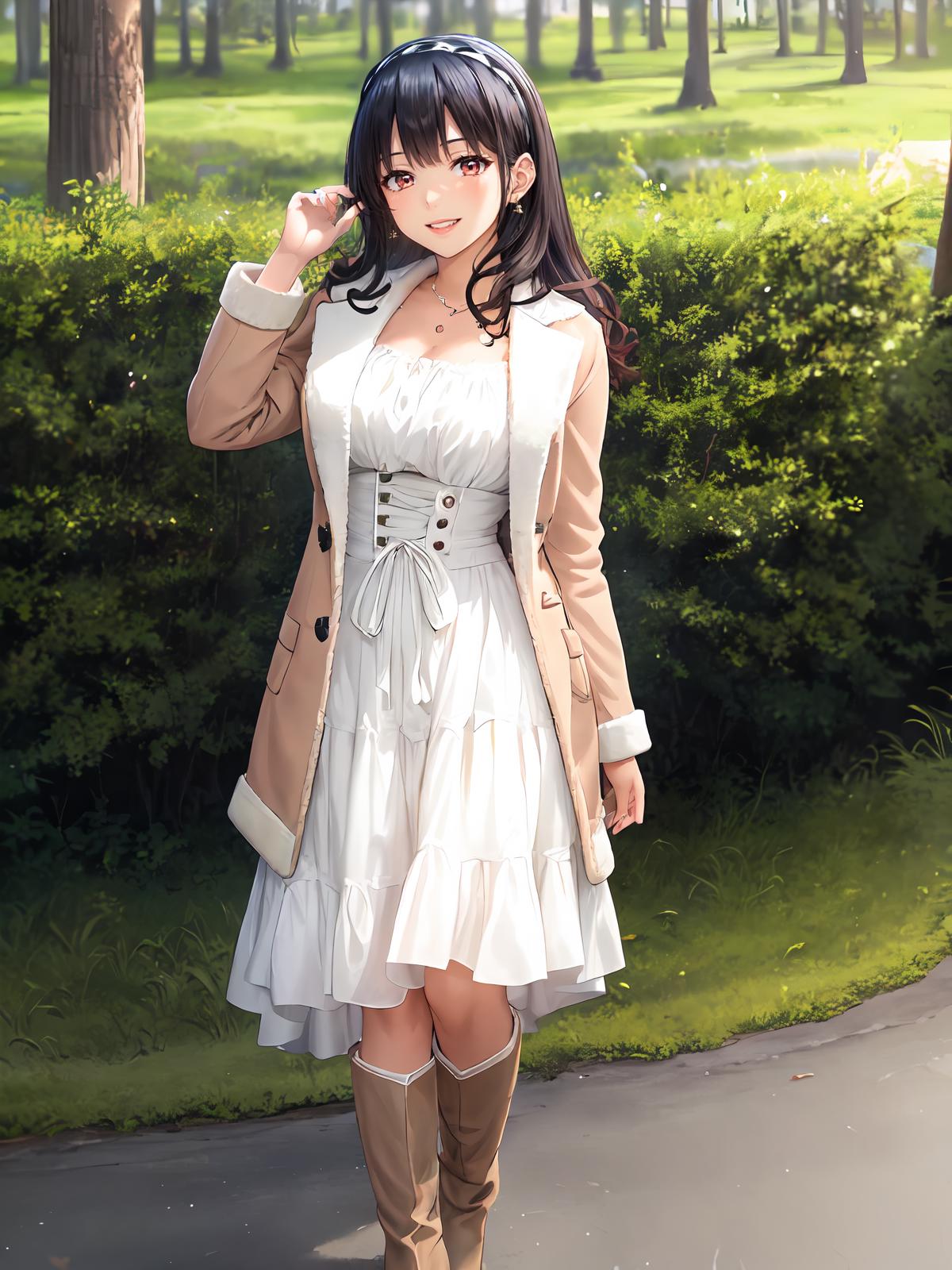 Prompts: long sleeves,ring,knee boots,white dress,coat,hairband, necklace,jewelry, boots, long hair, dress, black hair