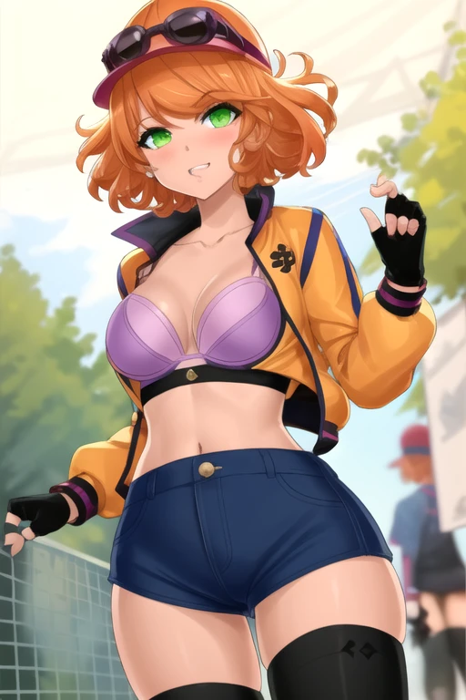 SandyBC, 1girl, solo, long hair, short hair, skirt, orange hair, thighhighs, black gloves, navel, cleavage, medium breasts, green eyes, orange jacket, short shorts, midriff, fingerless gloves, purple bra, crop top, sunglasses, baseball cap, eyewear on head, cropped jacket, denim shorts