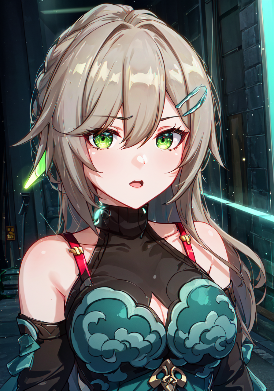 qingque hsr, two tails hair, looking_at_viewer, brown_hair, hair_ornament, bangs, green_eyes, grey_hair, detached_sleeves, socks, hairclip, dressi guess that is all, thanks you....