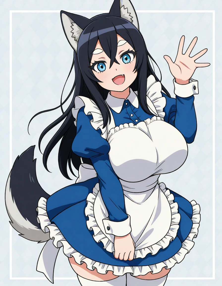husky-san,black hair,long hair,blue eyes,white eyebrows,black eyelashes,wolf ears,wolf tail,blue maid dress,white apron,sleeves,large breasts,white thighhighs