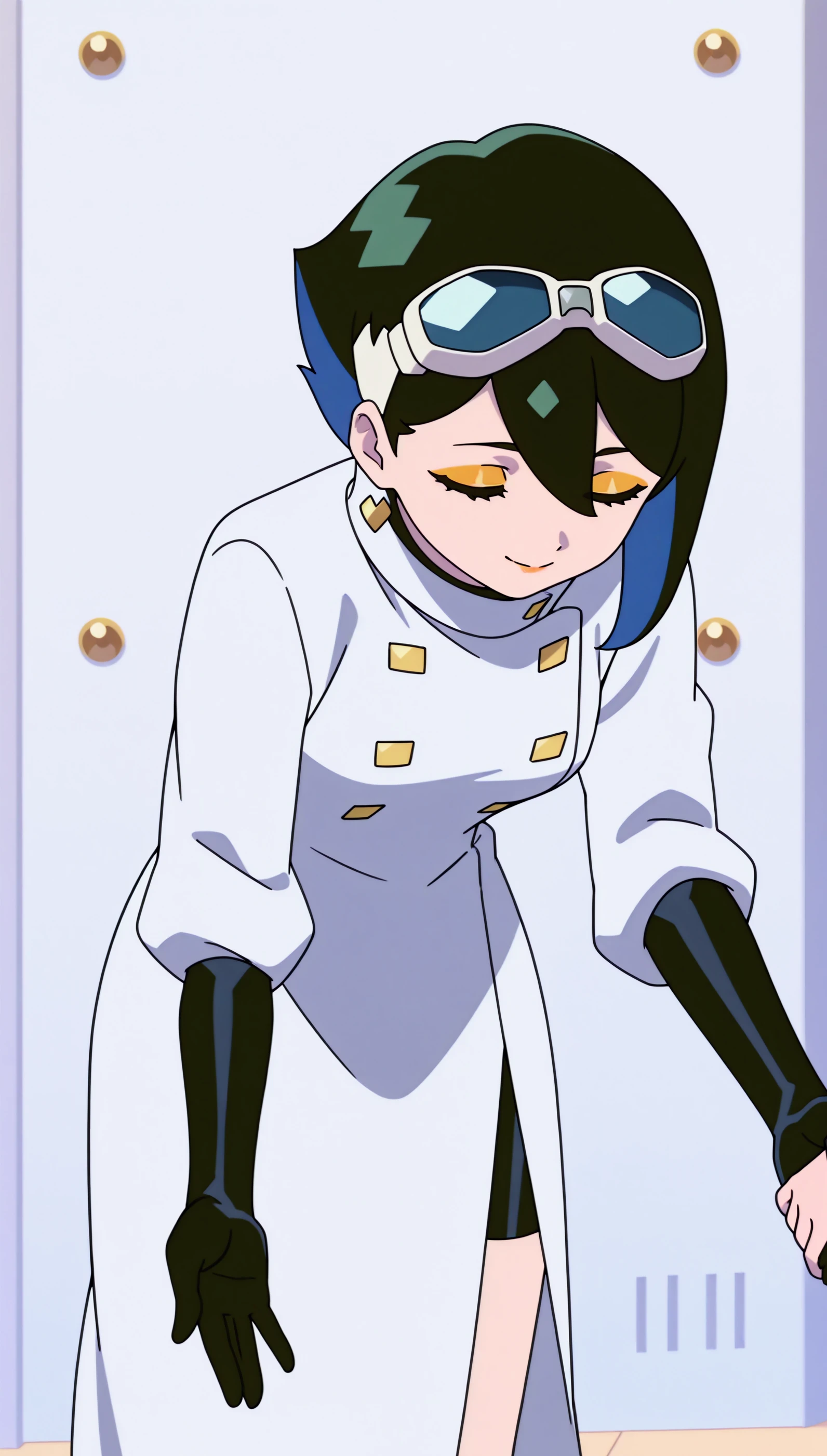 black skirt, socks, black footwear, high heels, pencil skirt, high heel boots, walking, goggles on head, labcoat, white coat