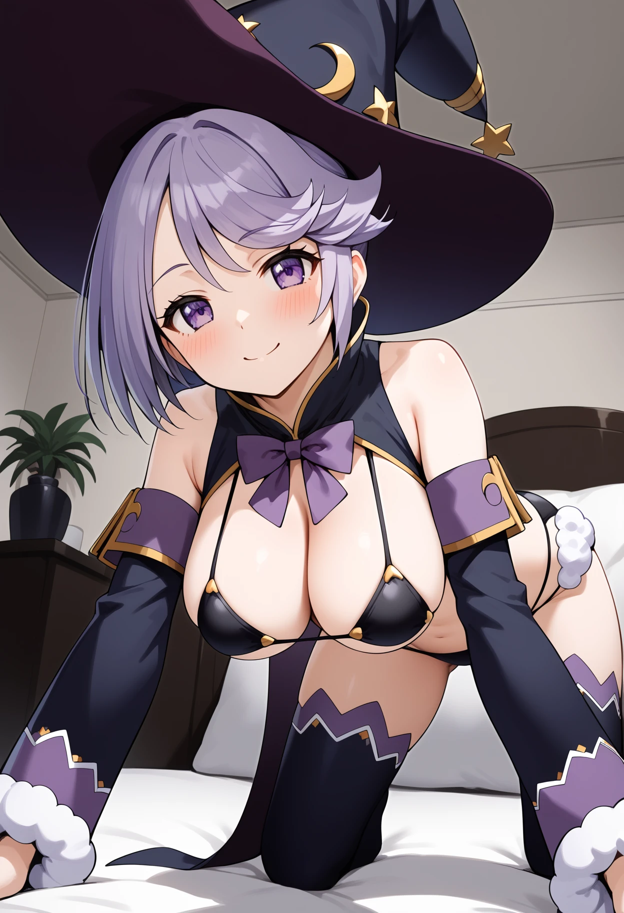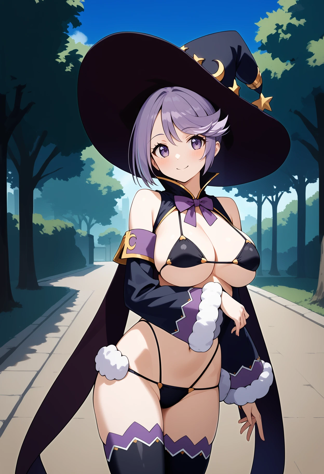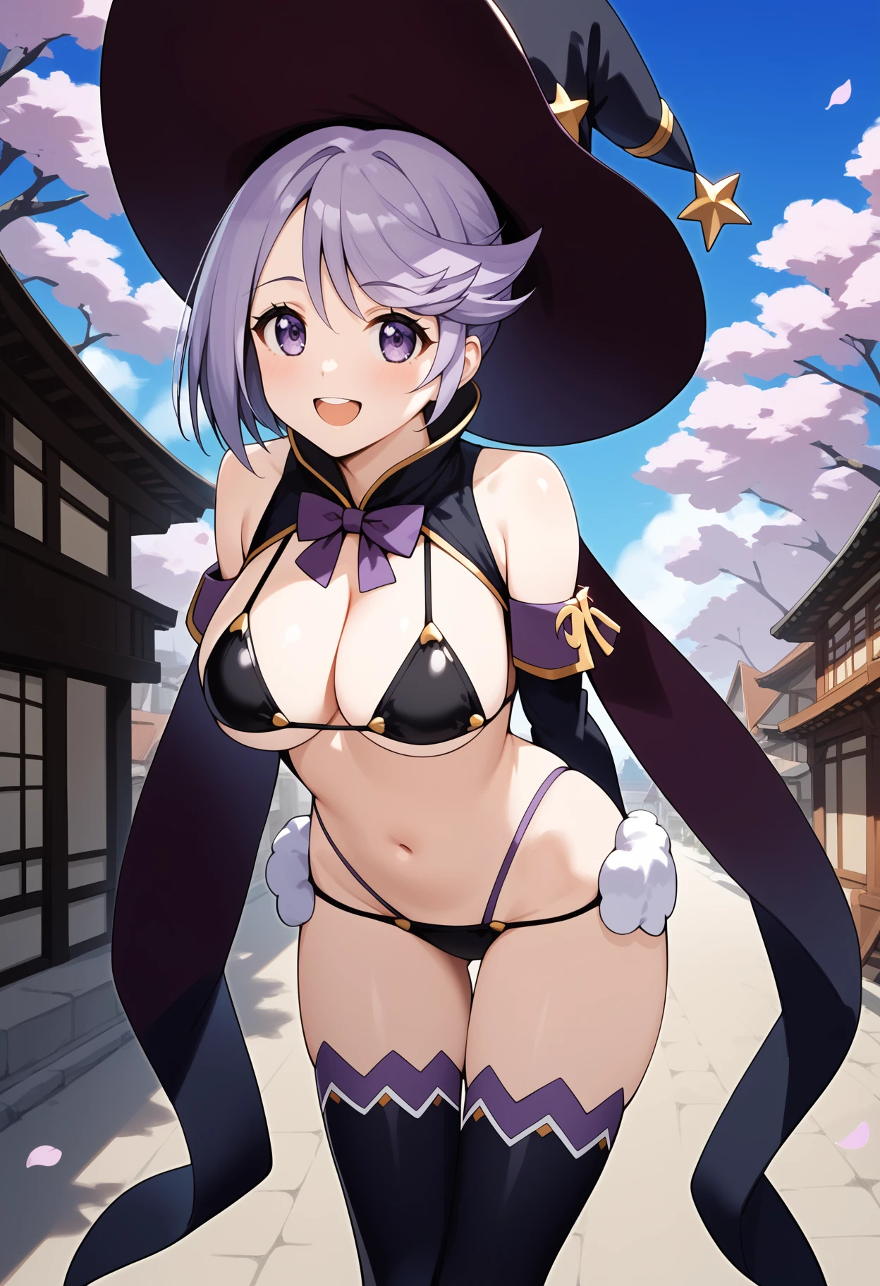 aamage, short hair, purple hair, witch hat, purple eyes, breasts, cape, purple bowtie, black bikini, detached sleeves, black thighhighs